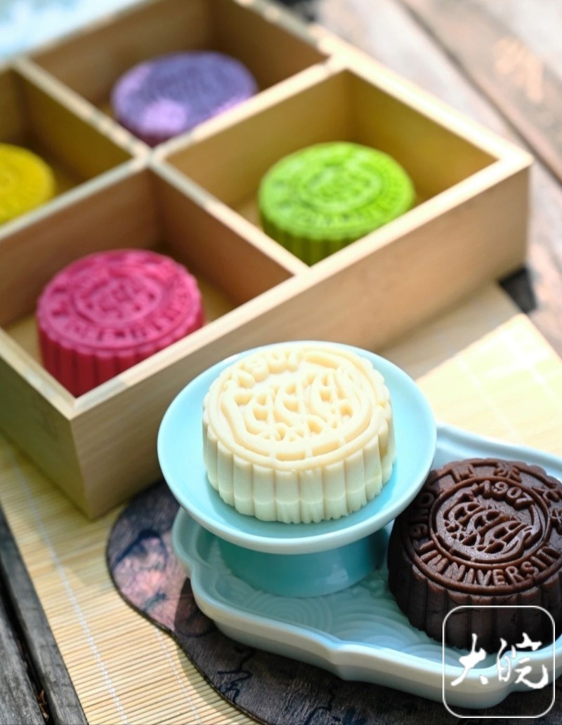 同济大学的“同济月饼”有桃山皮、苏式、广式三个系列,桃山皮月饼内馅既有奶黄椰蓉等传统口味,也有生椰拿铁、藤椒牛肉、芋泥奇亚籽、杨枝甘露等新选择。外皮同时创新,有抹茶、红酒、牛奶等口味。