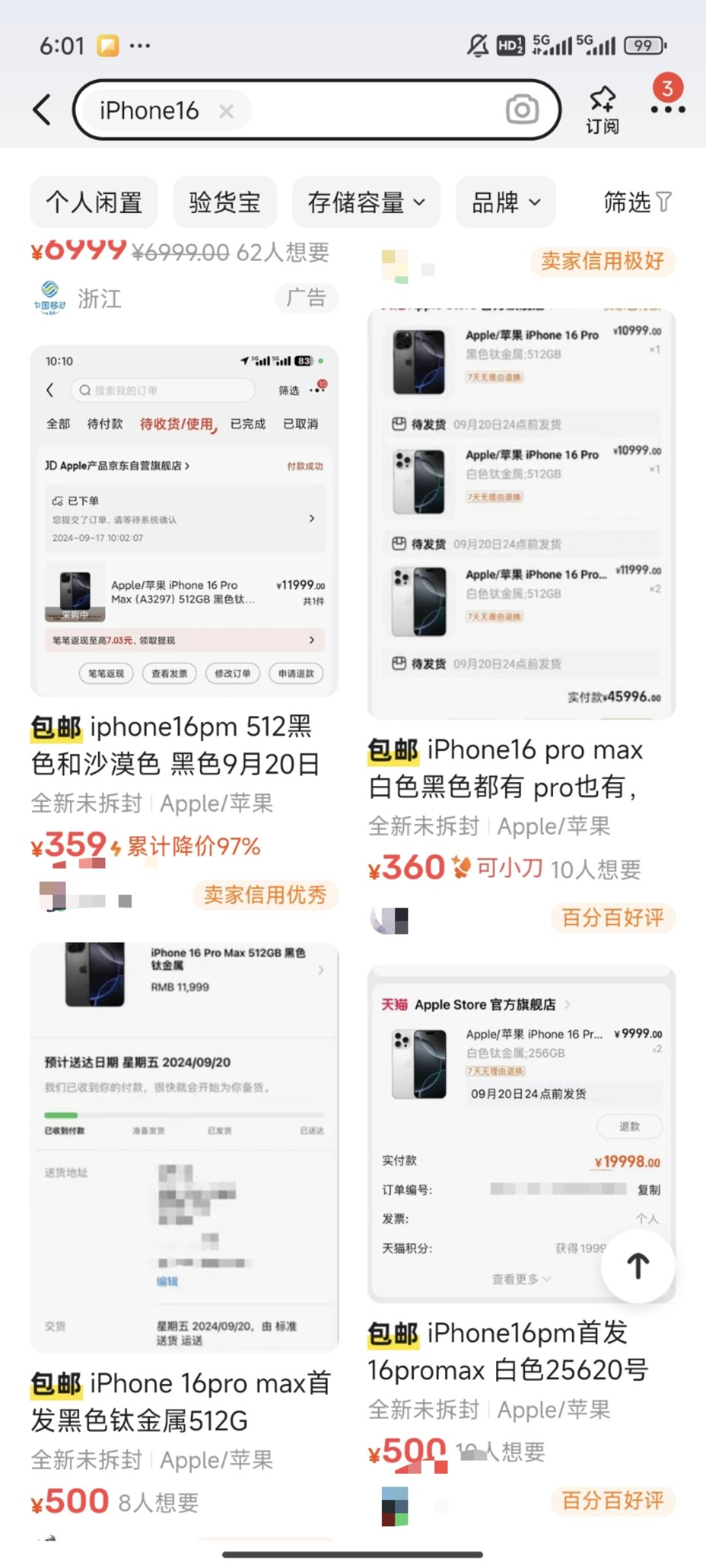9月18日,在闲鱼平台,记者看到有用户给出了代购iPhone 16系列的链接,但溢价基本在300—500元。