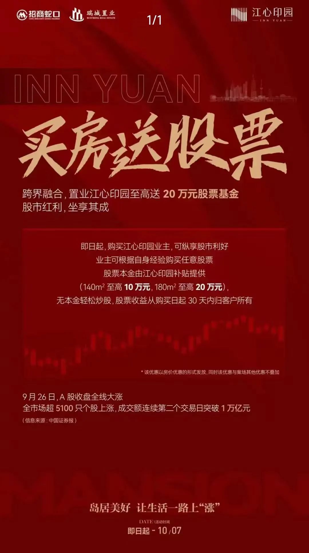 暨“大蒜换房”、“买房送黄金”、“买房送飞机”等花式营销后,近日又有一楼盘推出了“买房送股票”,9月28日,一张地产海报被广泛传播,招商蛇口南京江心印园项目推出“买房送股票”活动,最高送20万元股票基金。