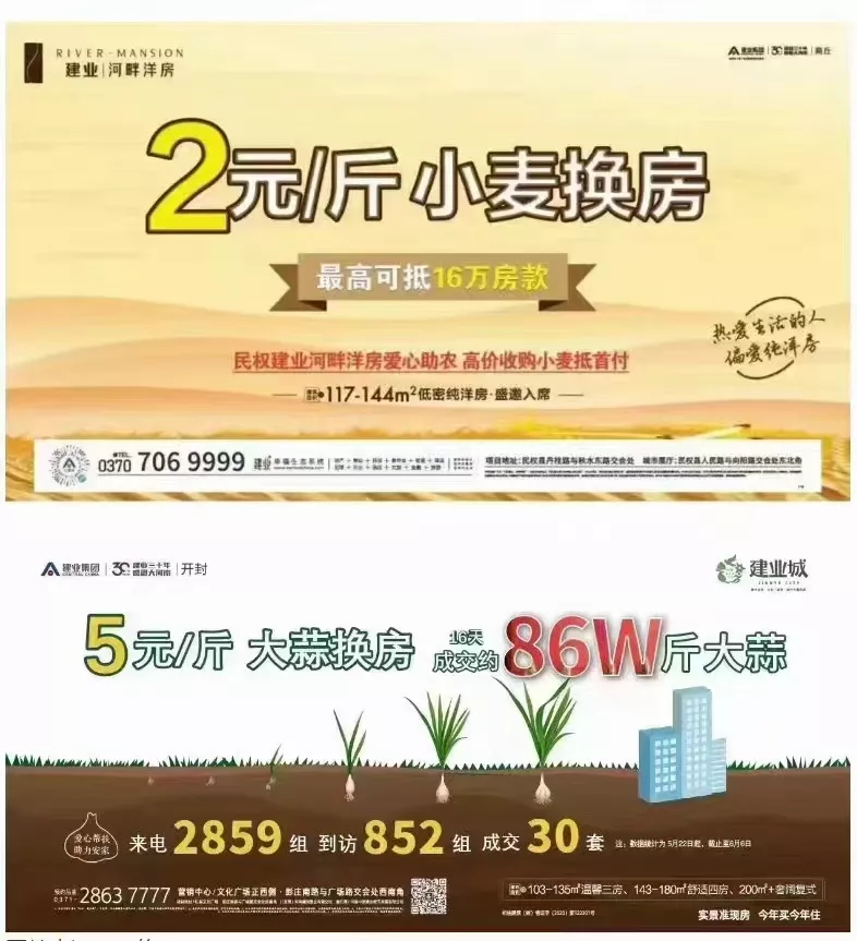 此外,2022年,河南建业集团旗下楼盘曾推出“大蒜换房”“小麦换房”两张营销海报,其中,一张海报上显示,“5元/斤”“大蒜换房”“大蒜抵首付”等字样。而在江苏省南京市江宁区,新城控股旗下楼盘曾推出“西瓜换房”,可以10元/斤收购西瓜抵付房款,每套房收购上限一万斤,最高可以抵扣10万元。