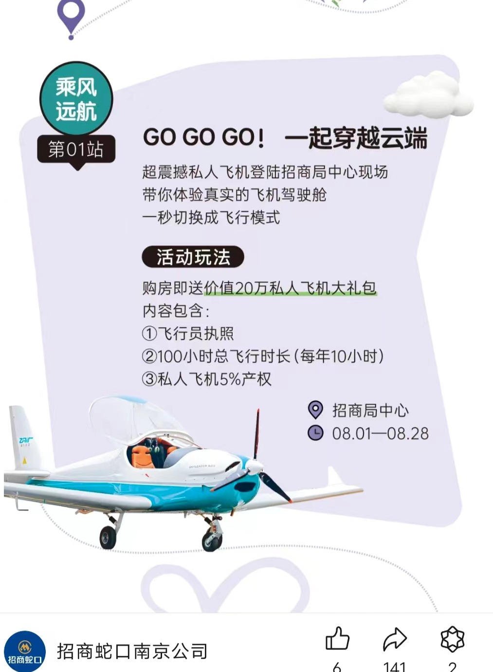 “花式卖房”不是一个新概念,潇湘晨报·辣椒财经记者搜索招商蛇口南京公司官方微信,并无该活动相关内容。不过该公众号内容显示,今年8月招商蛇口另一项目招商局中心·臻境项目曾推出过“买房送飞机”的活动,其内容显示购房即送价值20万私人飞机大礼包,内容包括飞行员执照、100小时飞行时长(每年10小时)、私人飞机5%产权。