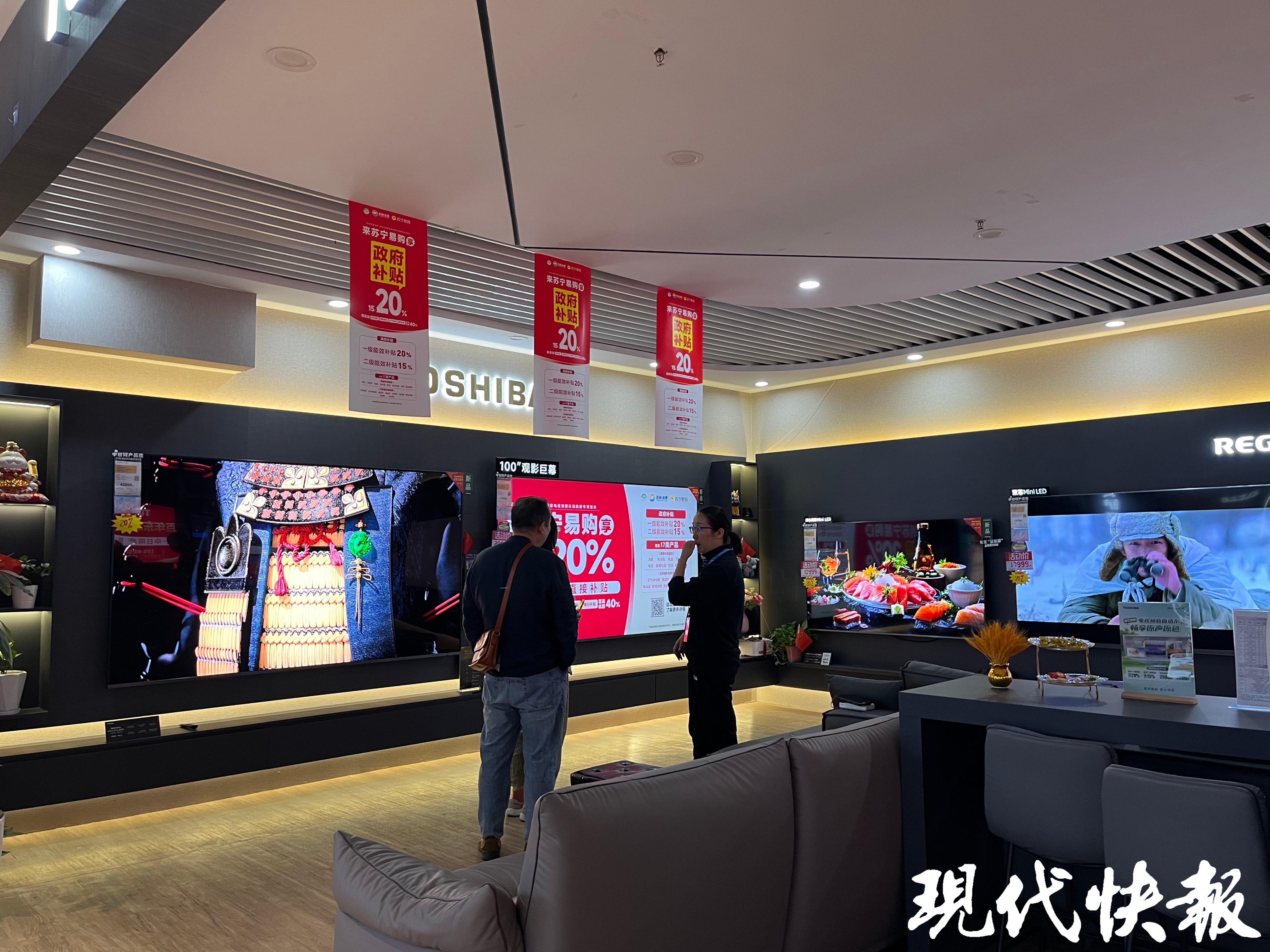 10月4日,在新街口的苏宁易购,市民蔡女士正在挑选电视机,家里用的电视机还是买二手房时卖家赠送的,已经用了多年,屏幕也出现了漏液等问题。“今年政府推出了以旧换新的政策,补贴力度挺大,正好国庆节就来挑选一下。”她看中了一款65寸的电视机,原价9200元,政府补贴20%,再加上商场和品牌的优惠活动,最后到手价是6500元左右,算下来便宜了2700元。