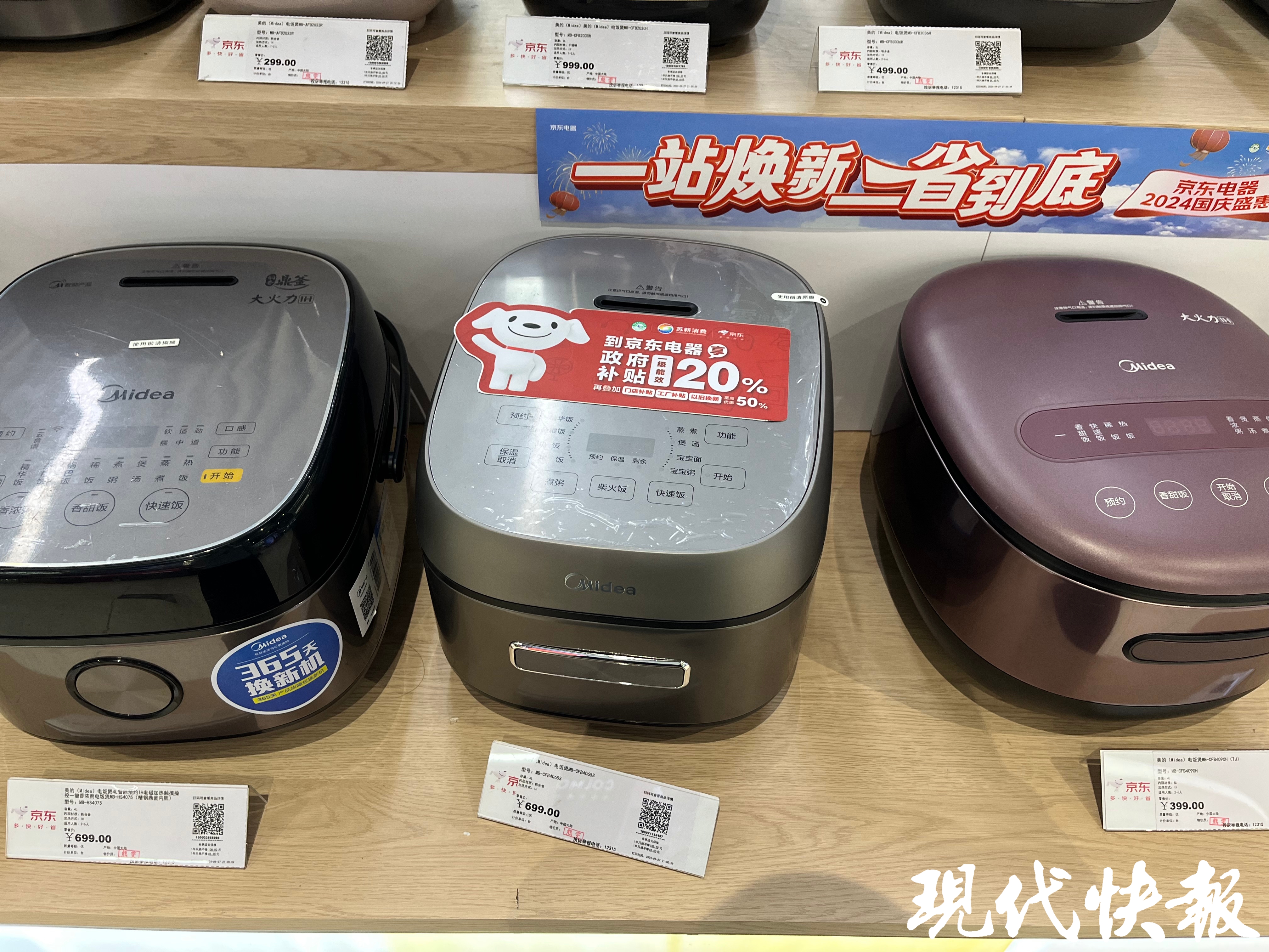 探访中现代快报记者发现,除了传统的冰洗类大家电,微波炉、电饭煲、电风扇等小家电也可以享受政策补贴。在新街口的京东电器,市民王先生和家人正在挑选电饭煲,“听说最近有以旧换新的活动,可以优惠多少?”导购表示,旧电饭煲拿来置换的话只有几块钱,但目前对于有节能降耗标识的产品可以享受政府补贴,“一级能效的可以补贴20%,二级能效的是15%,在标价上直接打折。像这款标价是699元,一级能效打8折,还可以叠加门店补贴、工厂补贴、旧机抵扣。”