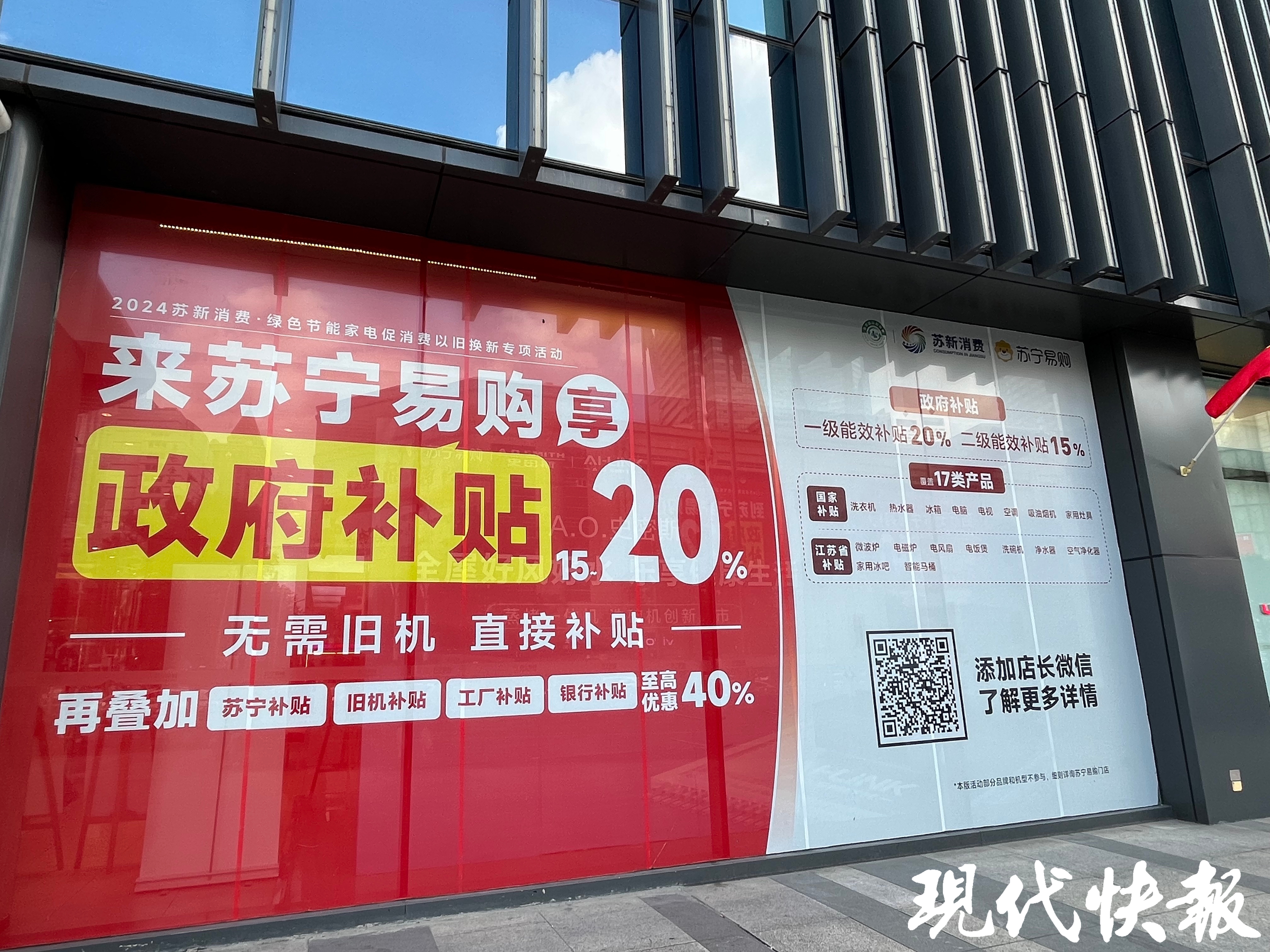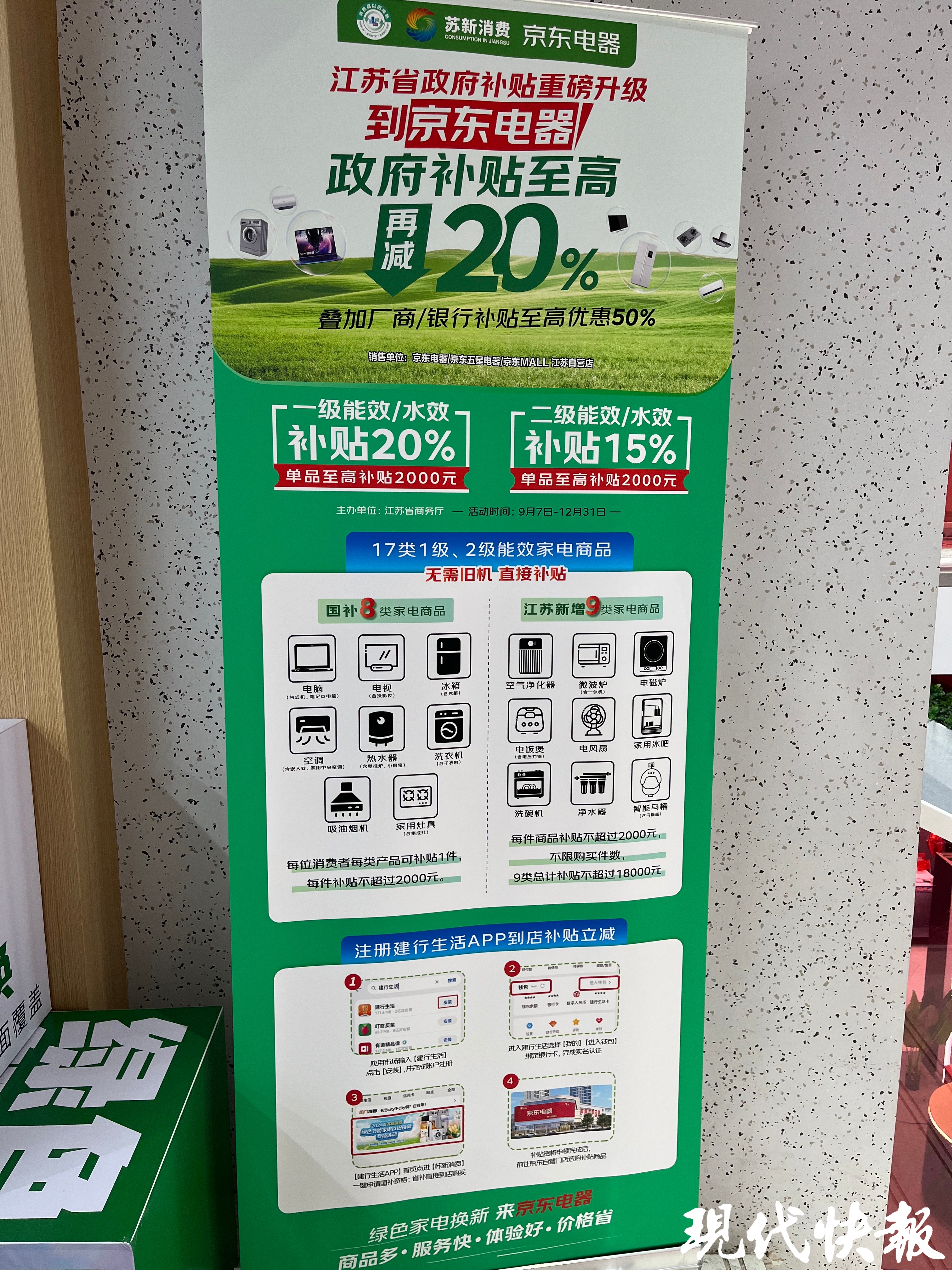 现代快报记者了解到,从9月7日起,江苏省开展2024年苏新消费·绿色节能家电以旧换新专项活动,截至12月31日。对符合条件的消费者在参与企业处购买补贴范围内2级能效或水效标准的家电产品,按照剔除企业所有优惠折扣后成交价的15%给予直接补贴;对购买补贴范围内1级及以上能效或水效标准的家电产品,按照剔除企业所有优惠折扣后成交价的20%给予直接补贴。