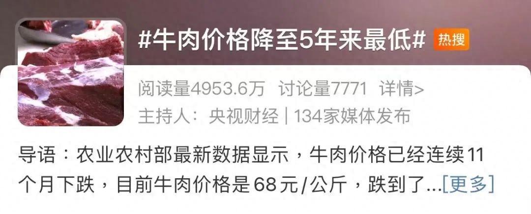 近日,牛肉价格降至5年来最低的话题冲上了热搜。