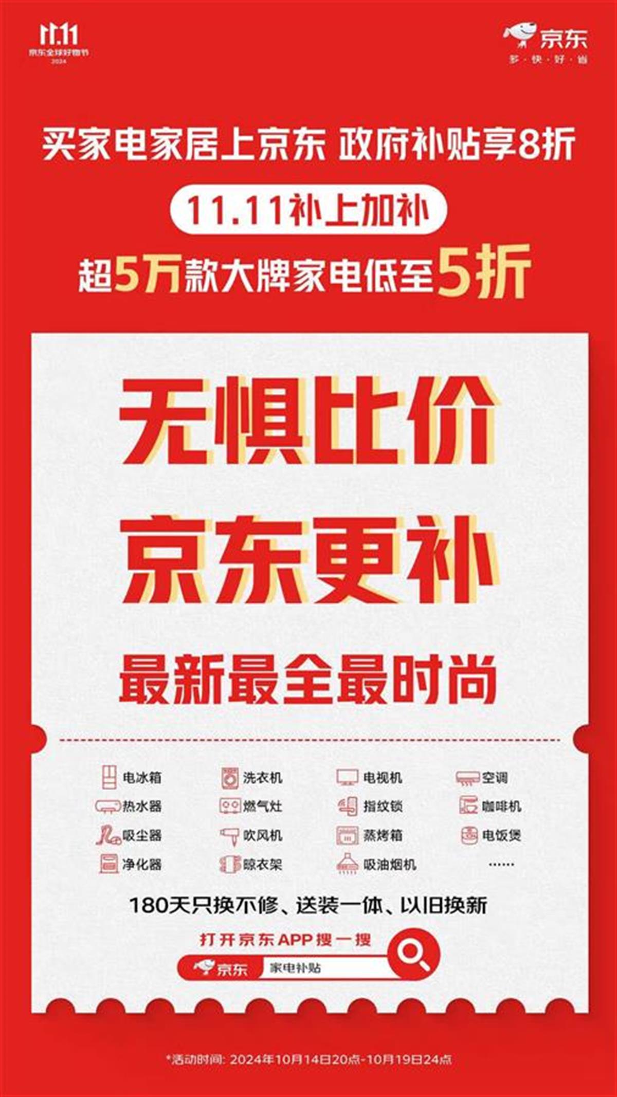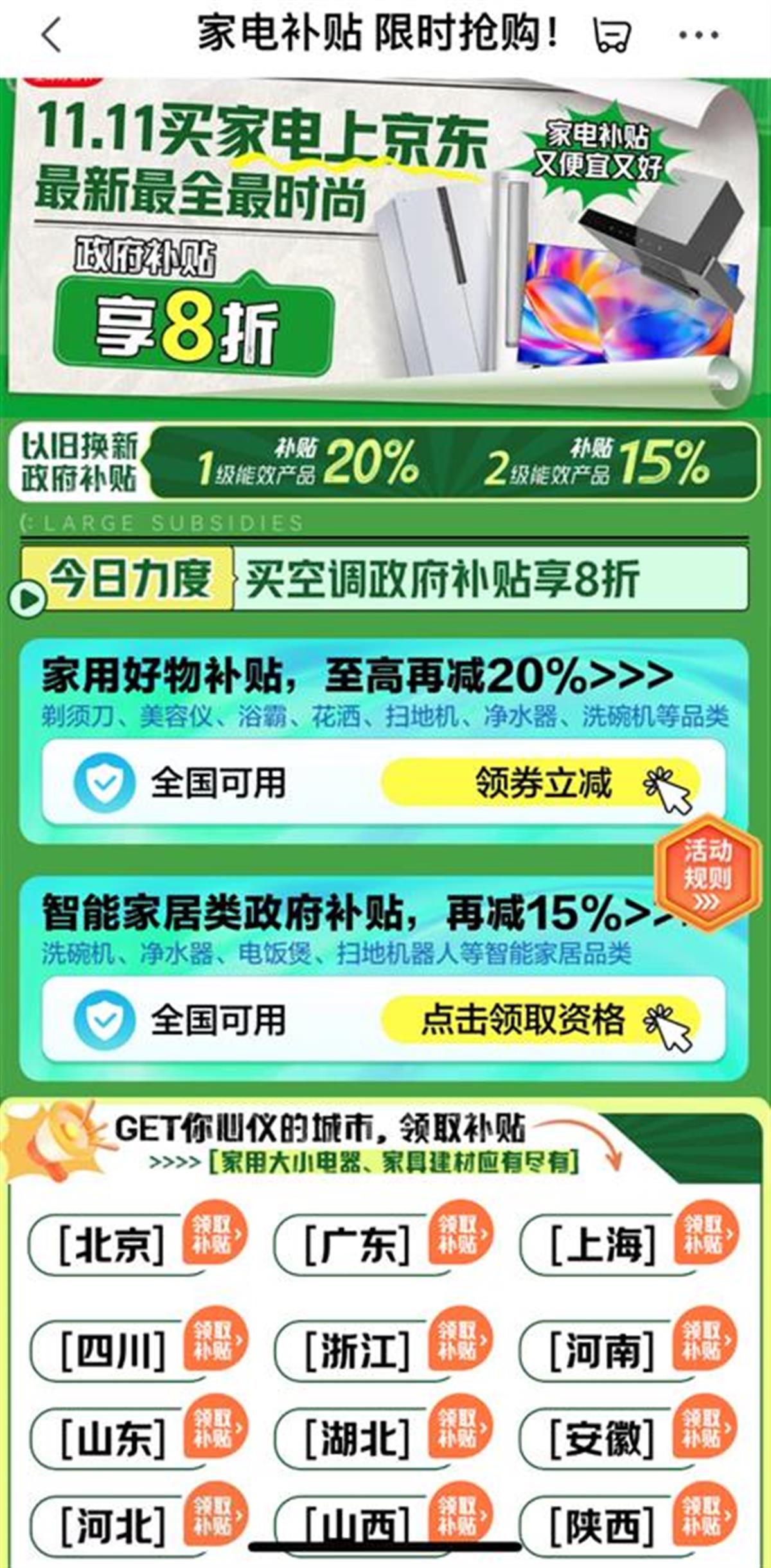 作为“国补”政策的承接平台,京东目前开启了超20省市家电换新活动专题页面,通过加大备货、新品上新、组合优惠、服务升级,让好产品、好价格、好服务直达用户,让国家政策红利更好、更快、更便捷地覆盖更多消费者。