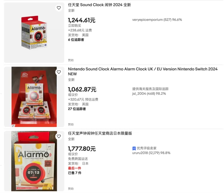 不仅在日本,10月21日,记者在线上购物和拍卖网站eBay搜索后发现,Alarmo在美国、欧洲等地的价格也普遍在1000人民币以上,远超发售价。不过据一些身在海外网友说,相对而言,目前在英国以及其他欧洲国家购买的难度要低一些。