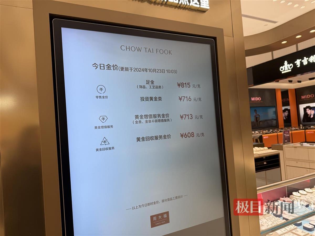 10月23日,极目新闻记者在洪山区多家商场珠宝专柜看到,品牌足金饰品每克挂牌价多在815元左右,以旧换新价格仅700元出头。