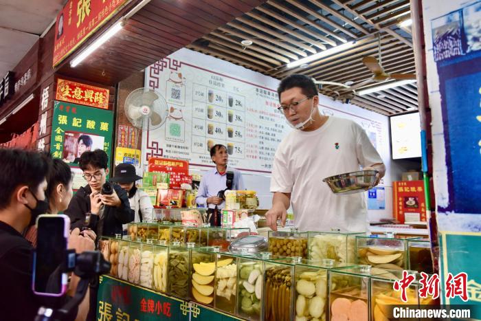 在梧州骑楼城五坊路张记酸果店,琳琅满目的酸嘢让人目不暇接。五颜六色的水果和蔬菜经过腌制,散发着独特的酸甜气息。采风团成员们纷纷驻足品尝。清爽可口的味道瞬间刺激了味蕾,让人食欲大增。