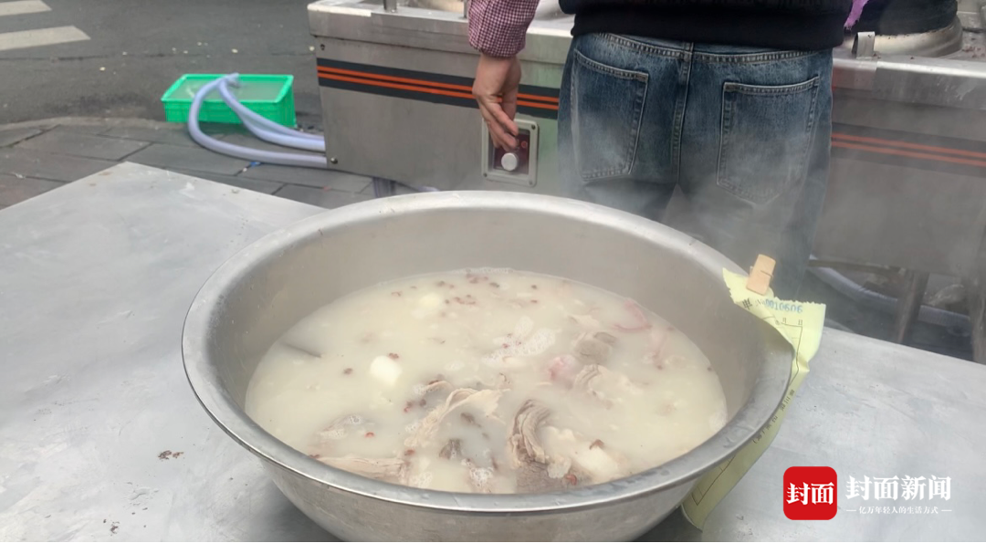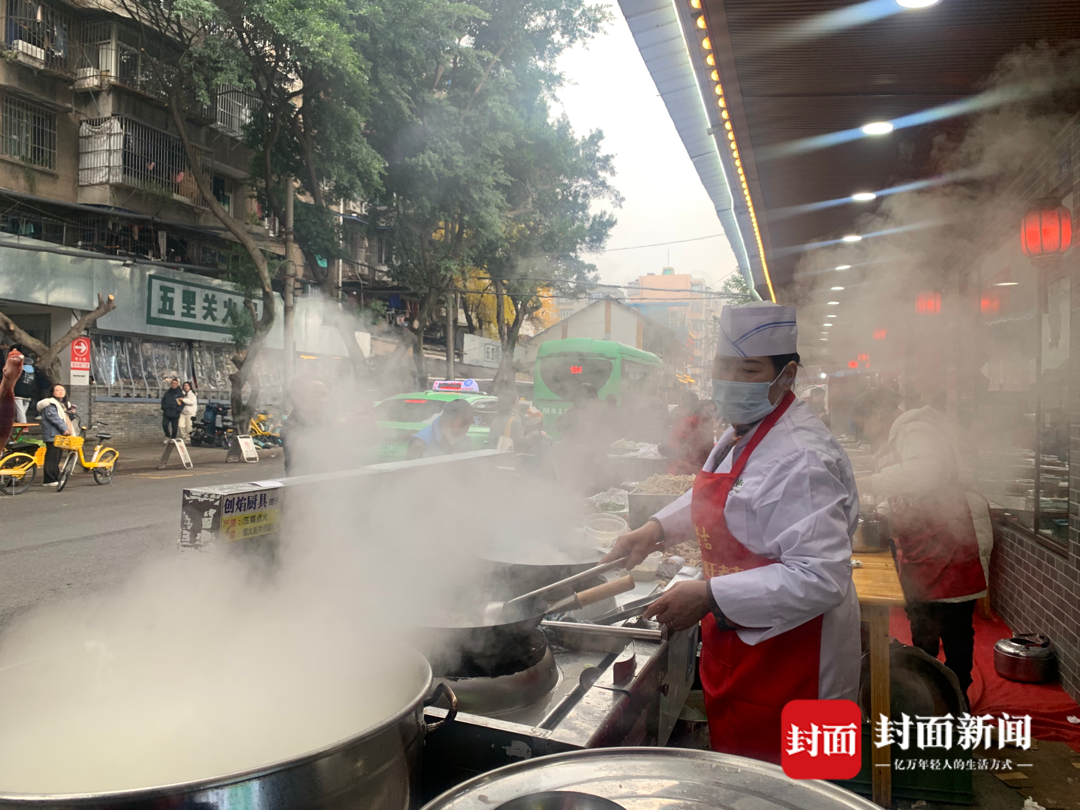 12月21日中午,封面新闻记者来到有着成都“羊肉汤一条街”之称的小关庙街走访。冬至到,羊肉俏。这里,街两边都摆上了桌椅,从街头到巷尾,都飘着“冬日限定”羊肉汤的热气和香味。