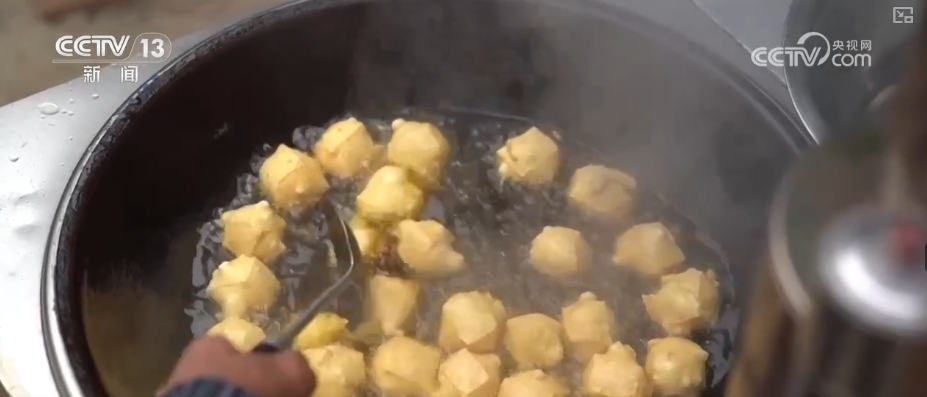 在安居古城火神庙街,一大早男女老少聚在一起,开始为中午的长街宴忙碌起来。居民肖华明围着沸腾的油锅,炸制特色美食酥肉,他想把这道自己的拿手菜分享给街坊邻居。