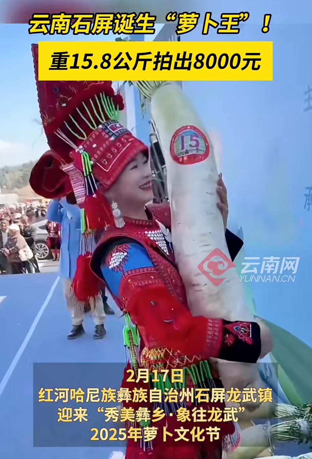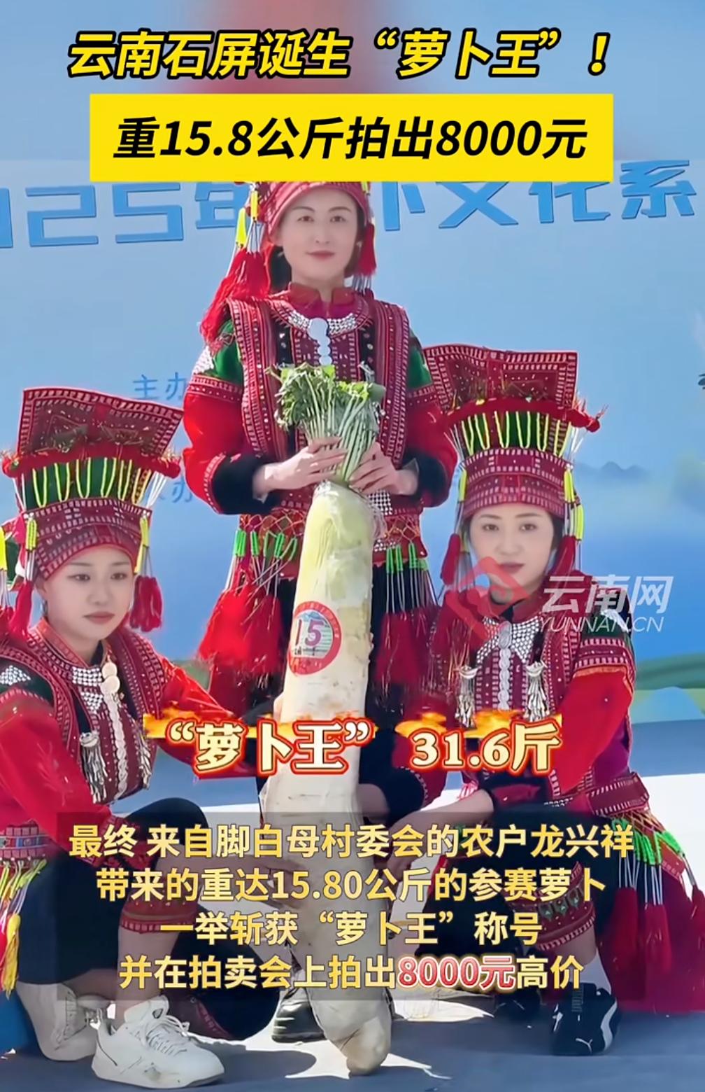 其中“萝卜王”争霸赛受到了现场观众和游客的广泛关注,最终,来自脚白母村委会的15.8公斤参赛萝卜,获得“萝卜王”称号,并在拍卖会上拍卖出了8000元的价格。