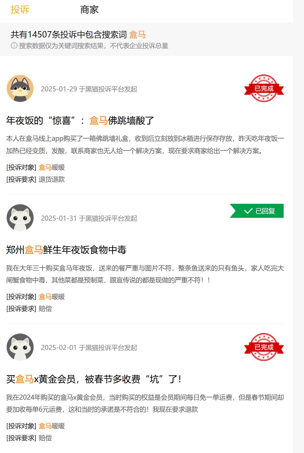 另据黑猫投诉平台,有超1万条投诉中包含搜索词“盒马”。