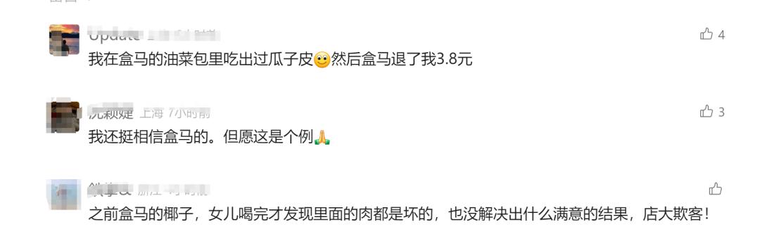 对于此事,网友热议。有人说“我还是挺相信盒马的,但愿这是个例”,有人说“以事实说话,该谁承担就谁承担”。