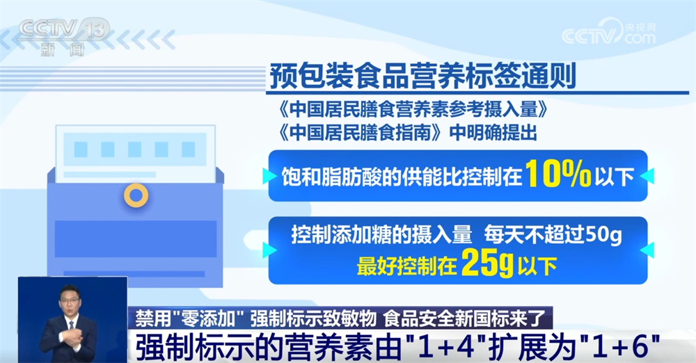 新的标准将强制标示的营养素范围由“1+4”,即能量和蛋白质、脂肪、碳水化合物、钠扩展为“1+6”,增加的两项是糖和饱和脂肪(酸),方便消费者根据个人需要选择消费,控制能量和脂肪、糖等的摄入。据了解,《中国居民膳食营养素参考摄入量》和《中国居民膳食指南》中明确提出,“饱和脂肪酸的供能比控制在10%以下”“控制添加糖的摄入量,每天不超过50g,最好控制在25g以下”。同时,营养标签还要增加“儿童青少年应避免过量摄入盐油糖”提示语。