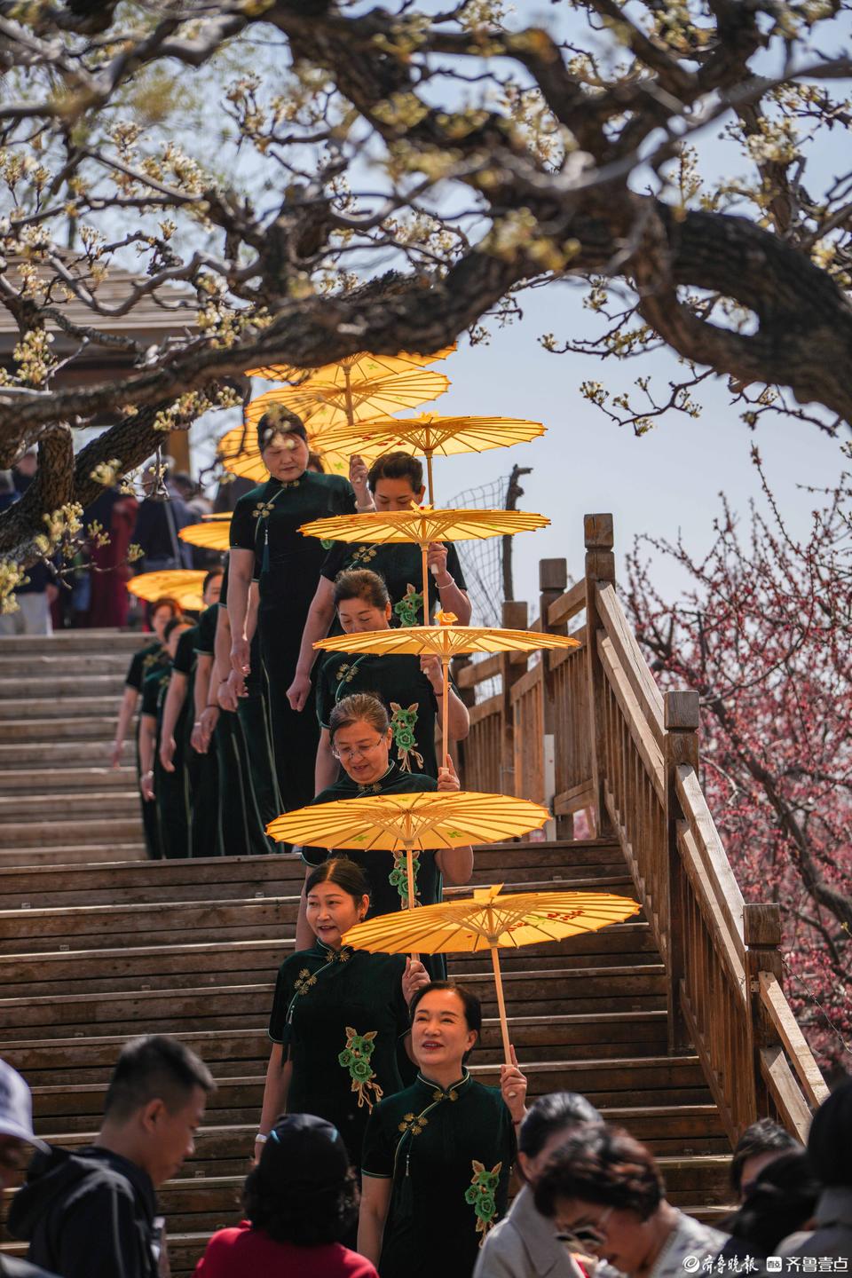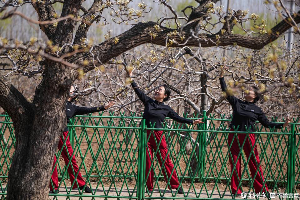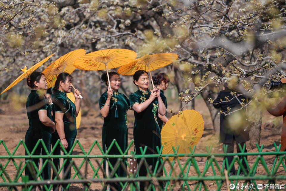 旗袍爱好者在山东省乐陵市大孙乡生态梨园打卡游玩。