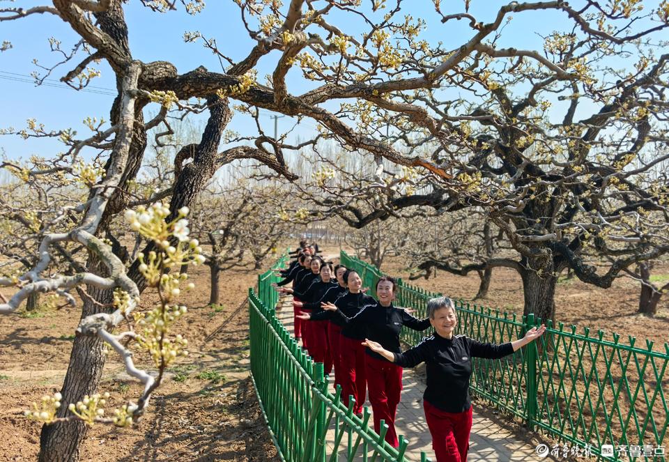 老年大学学员在山东省乐陵市大孙乡生态梨园进行舞蹈展演。