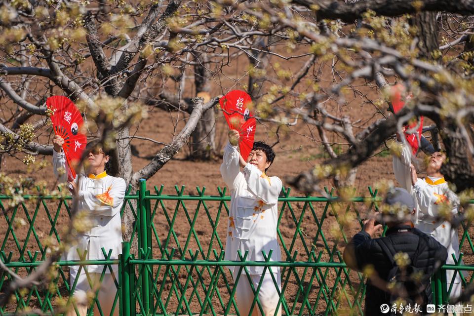 老年大学学员在山东省乐陵市大孙乡生态梨园进行太极扇展演。