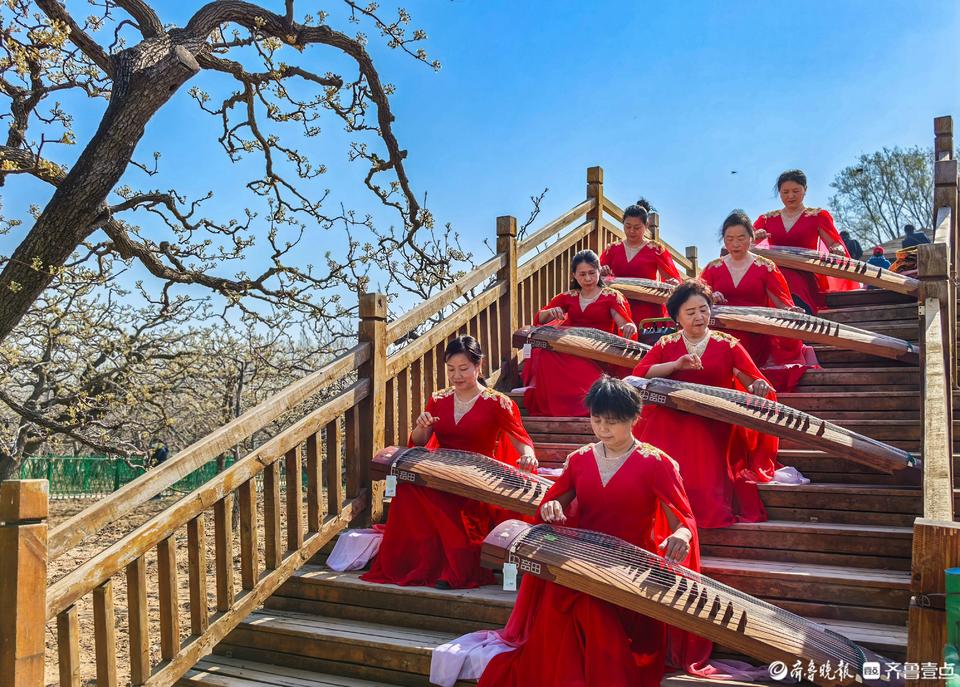 古筝爱好者在山东省乐陵市大孙乡生态梨园进行古筝展演。