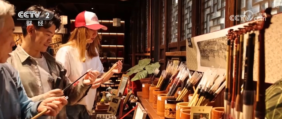 在南浔古镇的一家退税商店内,不少境外游客正在挑选自己心仪的商品。一位外国游客刚刚购买了一些文创产品和书法产品,按照他购买的金额计算,他可以退税53.5元。