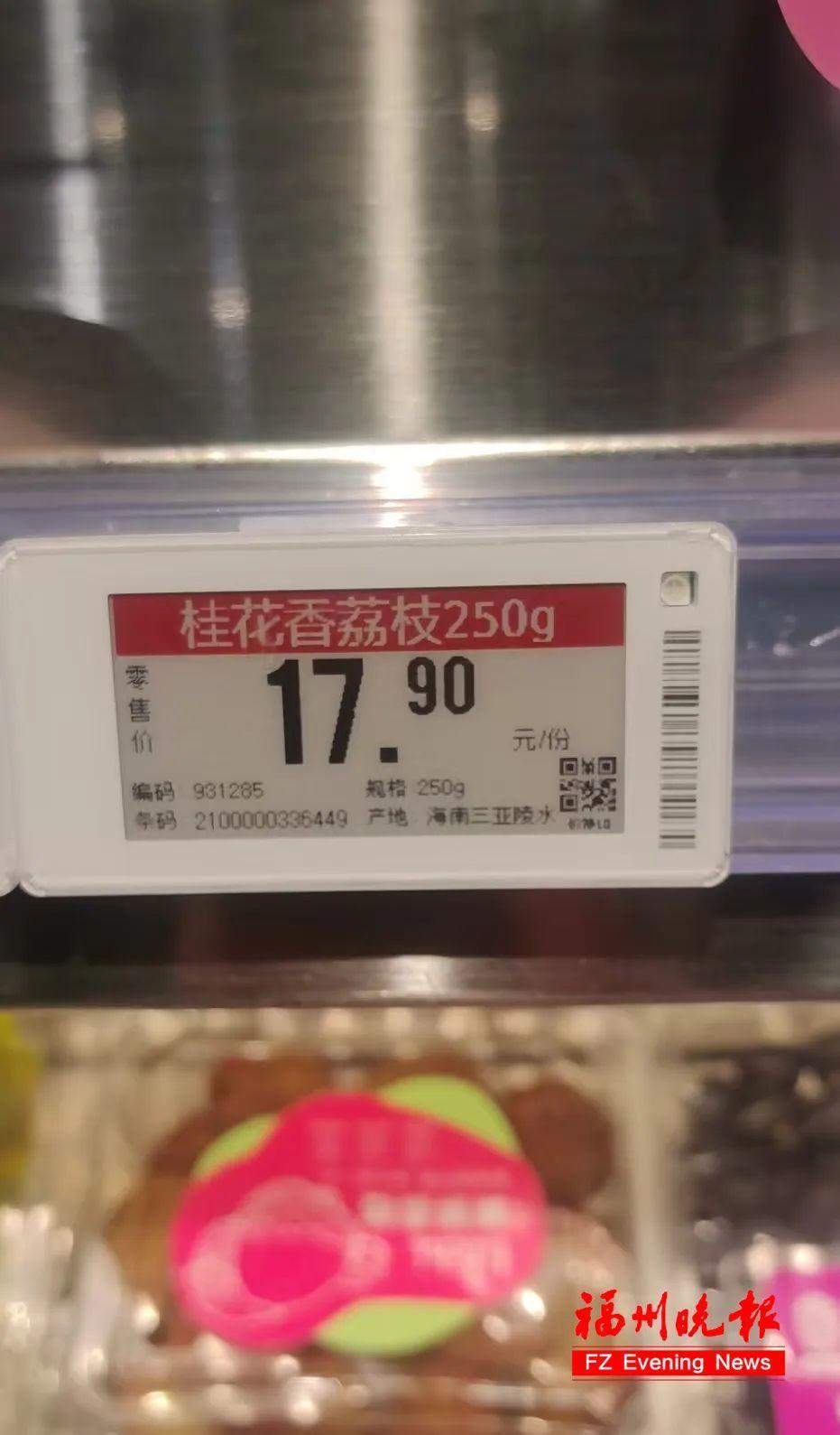 在永辉超市、朴朴超市线上平台,桂花香荔枝价格基本为15.88元至15.9元/250g,相当于32元/500g左右。而在永辉超市实体门店,价格为17.9元/250克,约36元/500g。在一些水果店,其价格更高,210元/1.5公斤,相当于70元/500g。