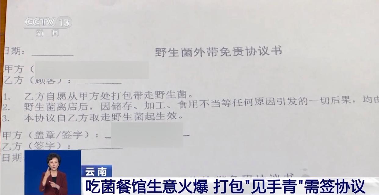 为了劝说食客不要打包外带见手青这类菌子,有商家甚至推出了免责声明,消费者如果要外带,需要签订一份免责协议。记者看到,这份免责协议书一共有三个条款: