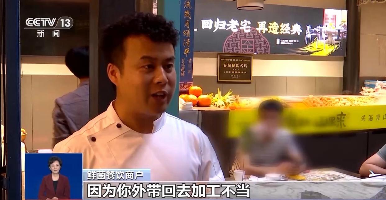 鲜菌餐饮商户:我们都不建议外带,因为带回去加工不当,如拿微波炉加热食用,会出现身体不适,导致不良反应。所以我们餐厅要求不可以外带,外带是有风险的。