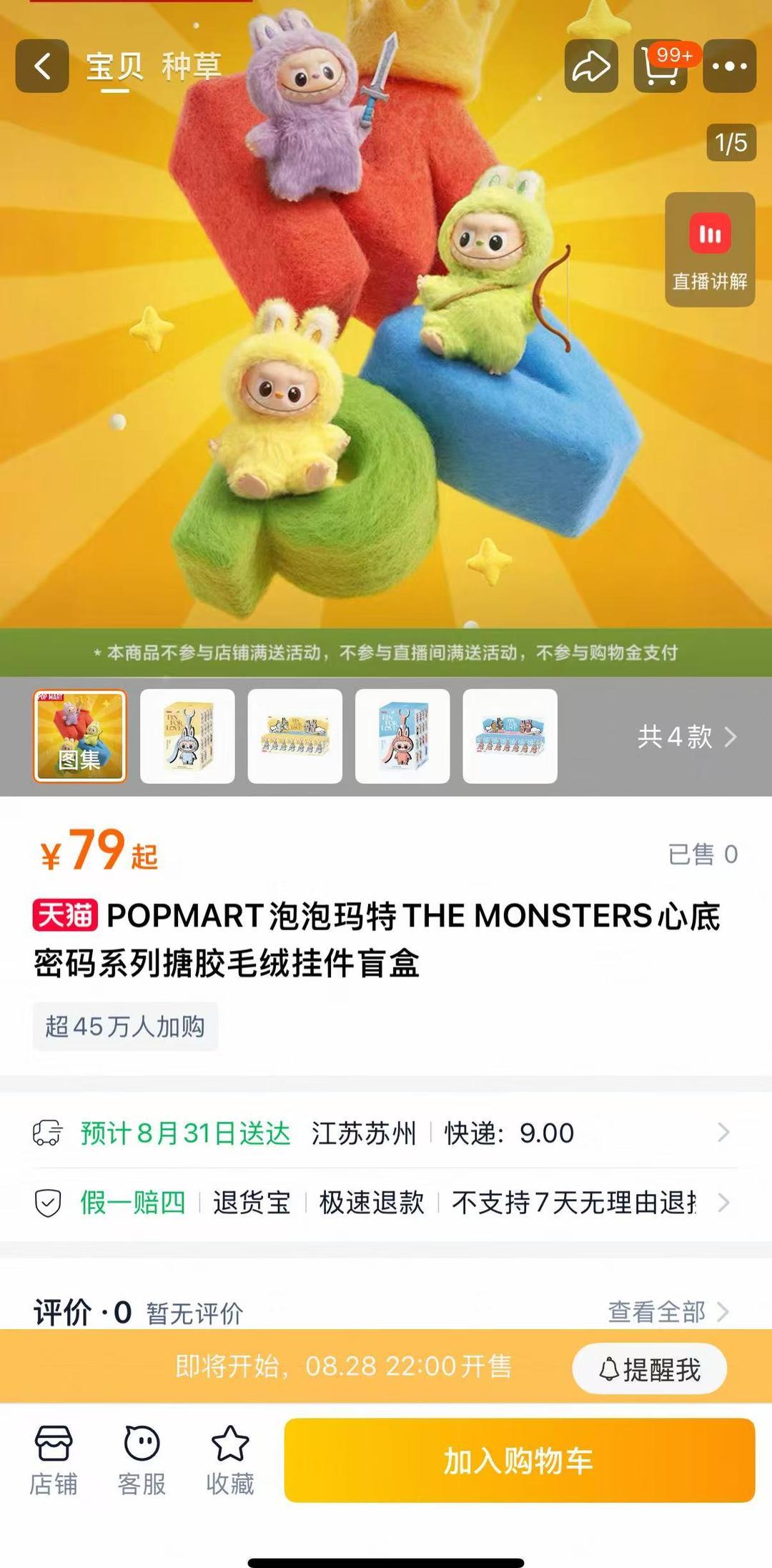 截至发稿,天猫泡泡玛特旗舰店页面信息显示,已有超45万人将迷你版LABUBU加购,泡泡玛特小程序等官方渠道则暂未显示预约数。