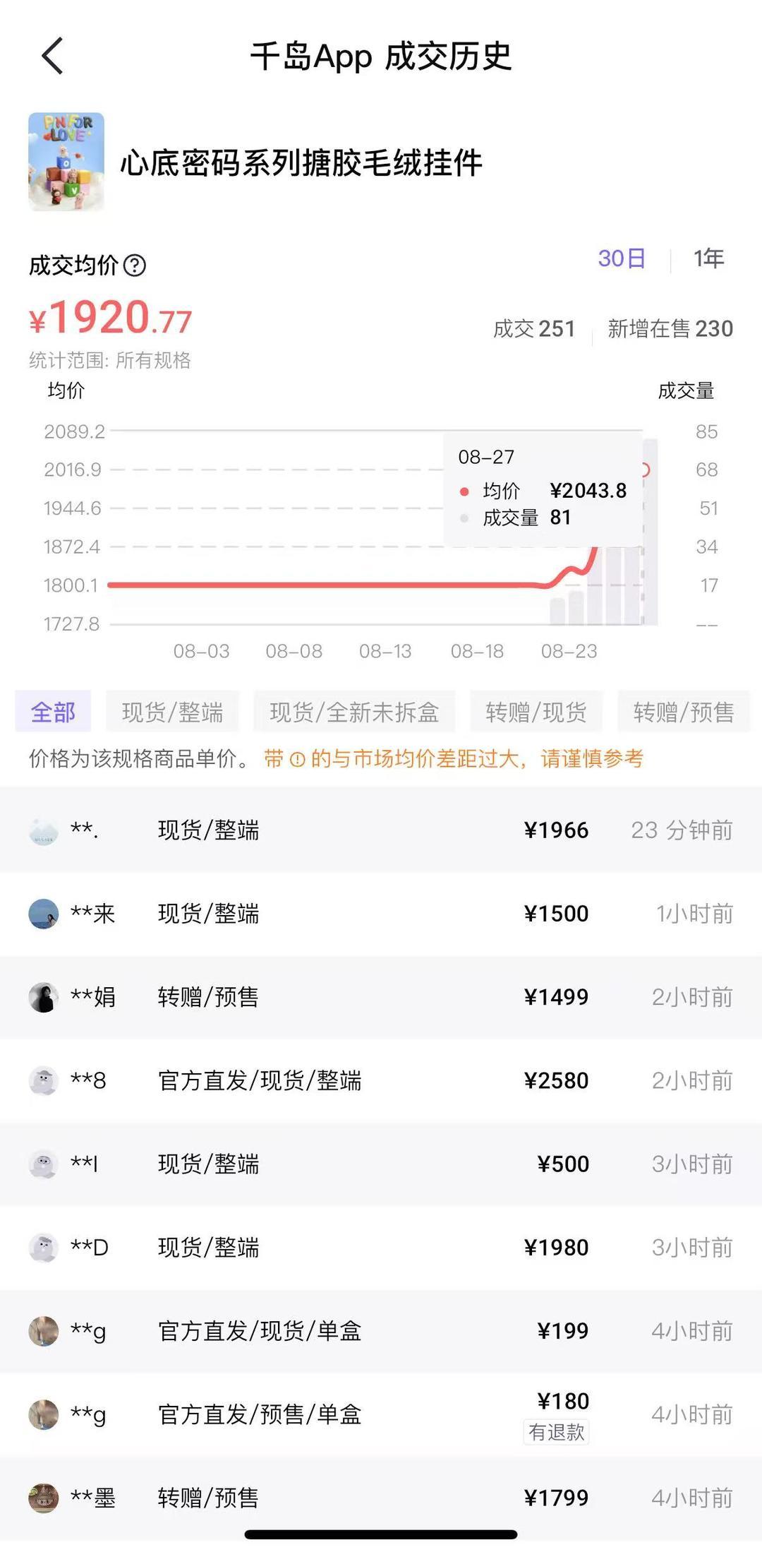 与此同时,在潮玩二手交易平台已有700余件迷你版LABUBU“在售”,已成交251件,截至发稿,成交均价为1920.77元。而在今日下午,有用户以2580元成交整端。在平台“求购”的用户出价中,用户愿意为整端盲盒付费的价格在1300元至2150元不等。