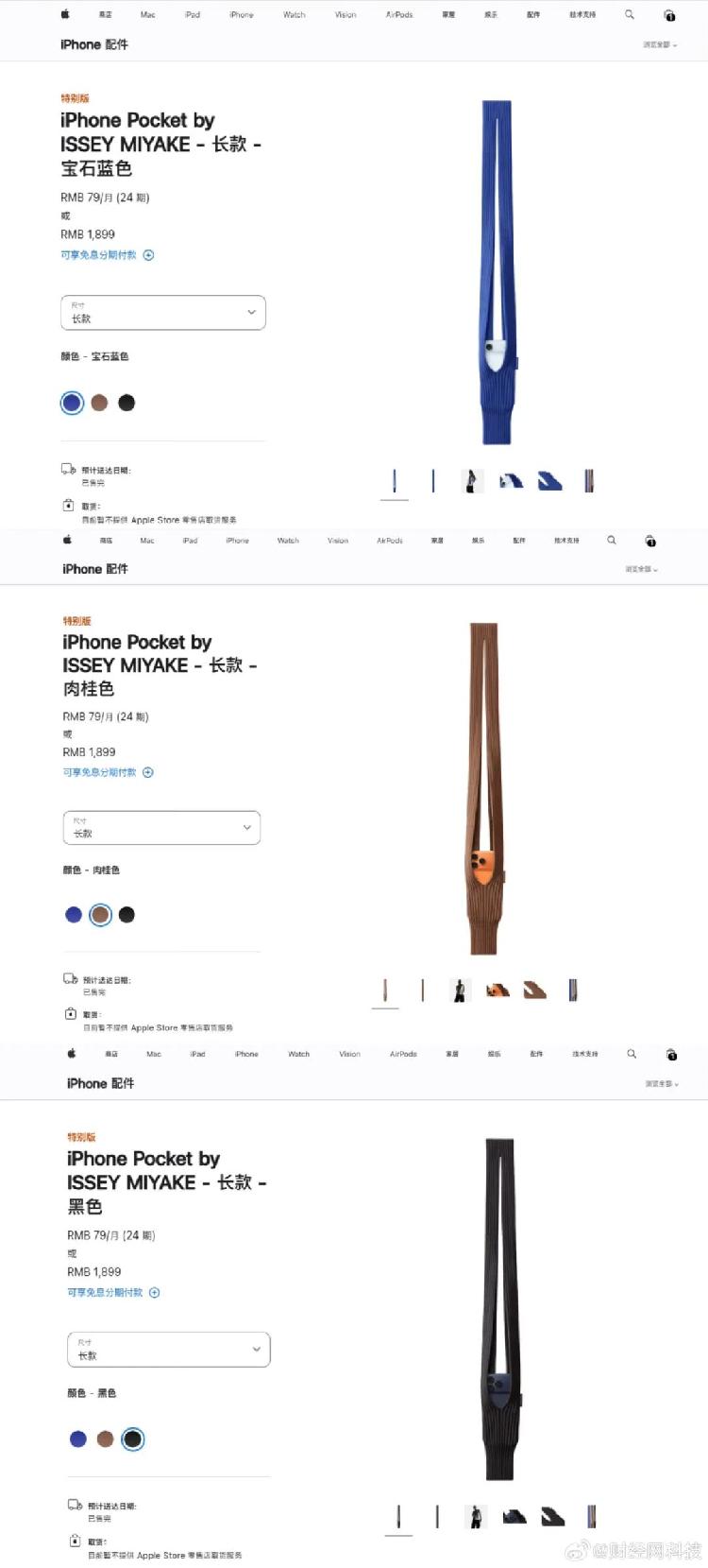 11月14日,苹果与三宅一生(ISSEY MIYAKE)联合推出的全新配件iPhone Pocket(针织手机包)正式开售,短带款售价1299元、长带款售价1899元。