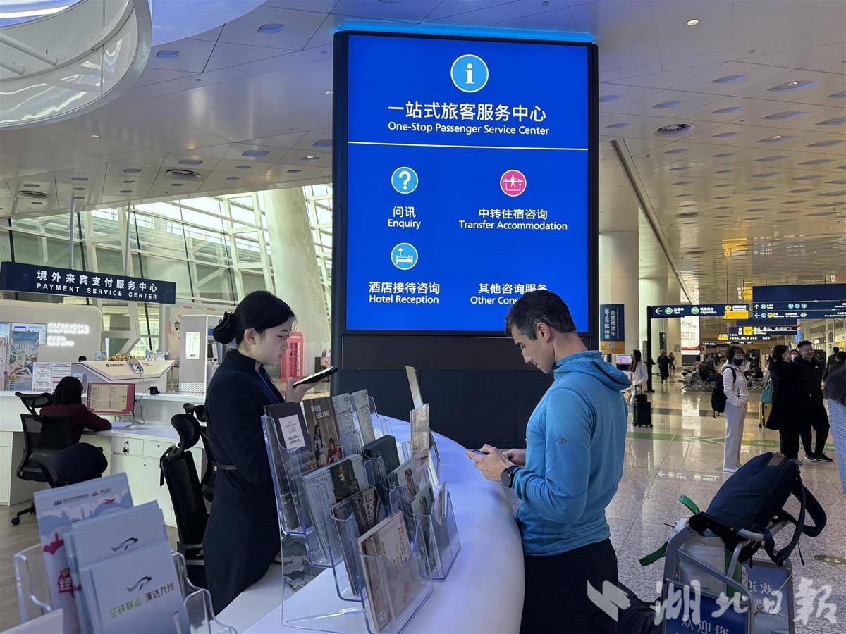 外籍旅客在天河机场一站式旅客服务中心咨询酒店信息。(湖北日报全媒记者 李源 摄)