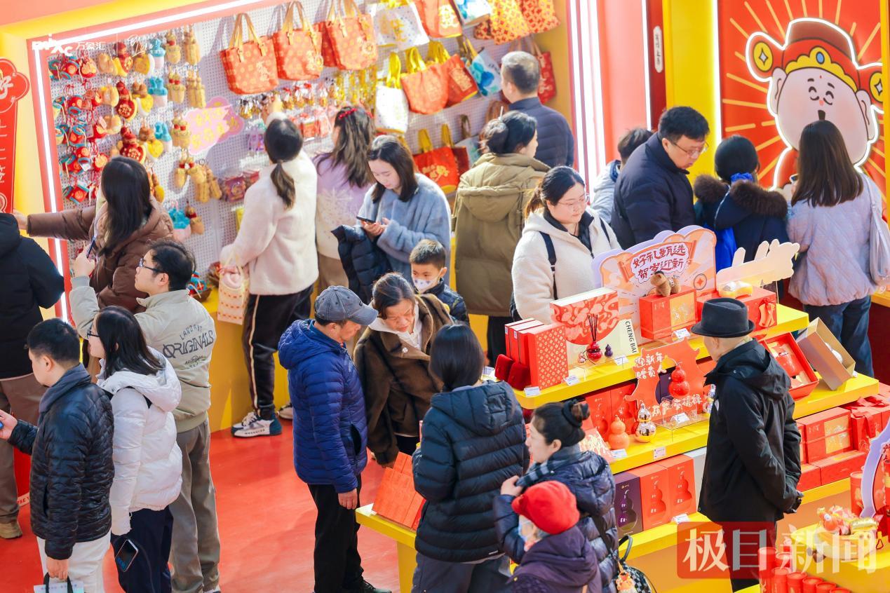 元旦当天,极目新闻记者在现场看到,多种祈福、生肖、文创等商品前挤满了顾客,精心挑选专属愿景的新年礼物。