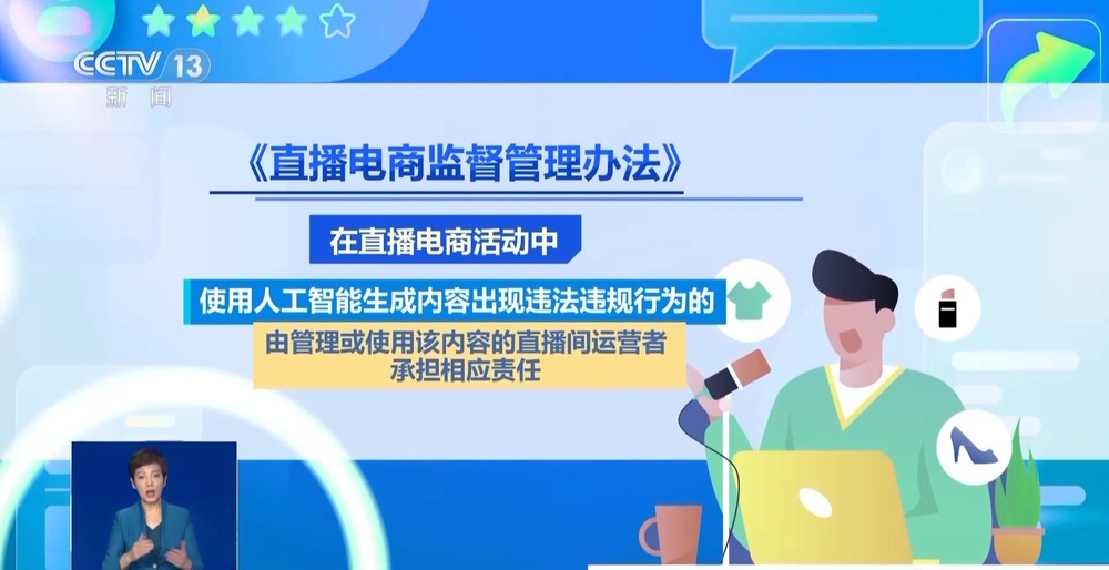 此外,《办法》明确,在直播电商活动中,使用人工智能生成内容出现违法违规行为的,由管理或使用该内容的直播间运营者承担相应责任。