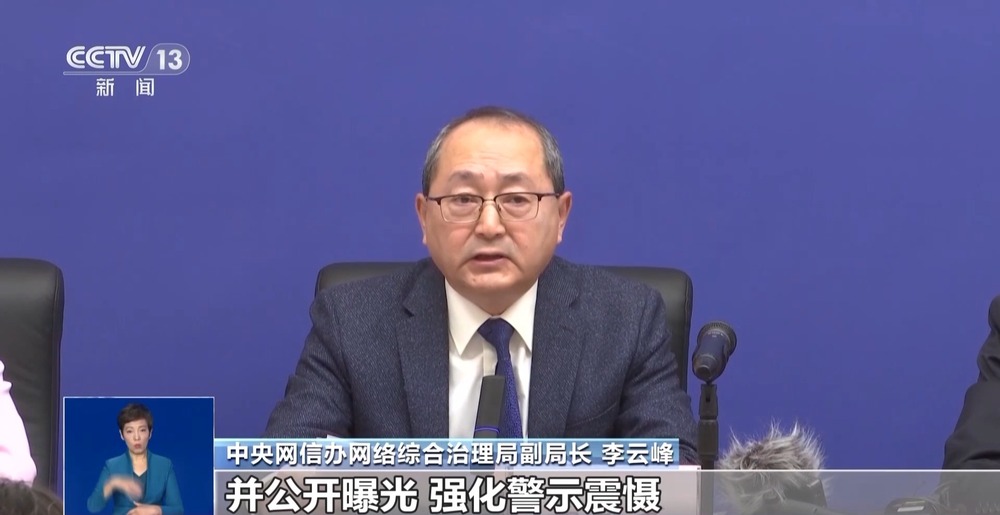 中央网信办网络综合治理局副局长李云峰:对主体责任履行不到位的网站平台,以及问题突出、顶风作案的网络账号、直播间和MCN机构,我们将依法依规从严予以处置处罚,并公开曝光,强化警示震慑。