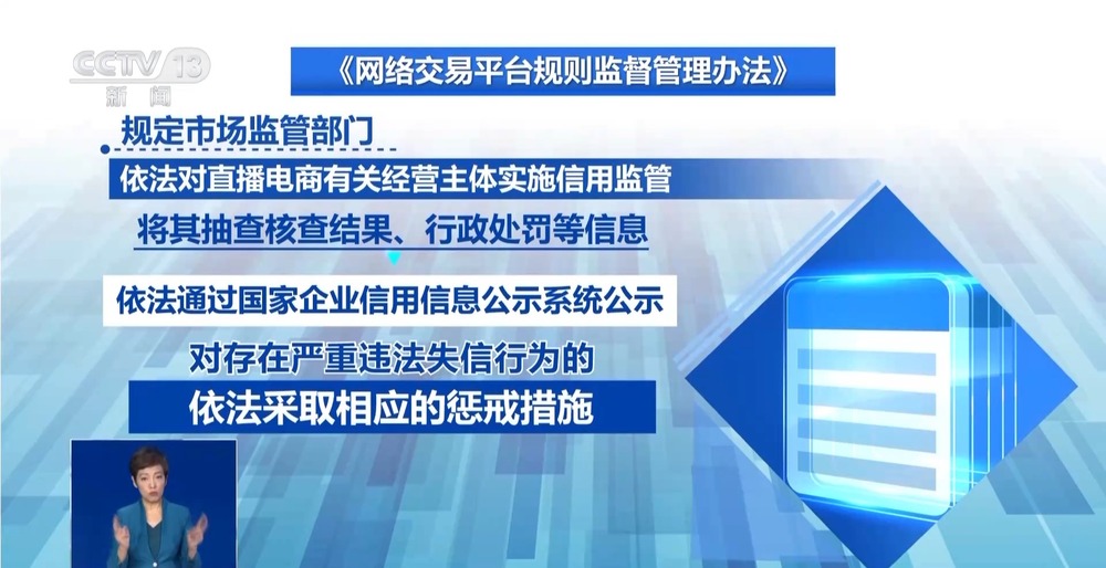 同时,规定市场监管部门依法对直播电商有关经营主体实施信用监管,将其抽查核查结果、行政处罚等信息,依法通过国家企业信用信息公示系统公示,对存在严重违法失信行为的,依法采取相应的惩戒措施。
