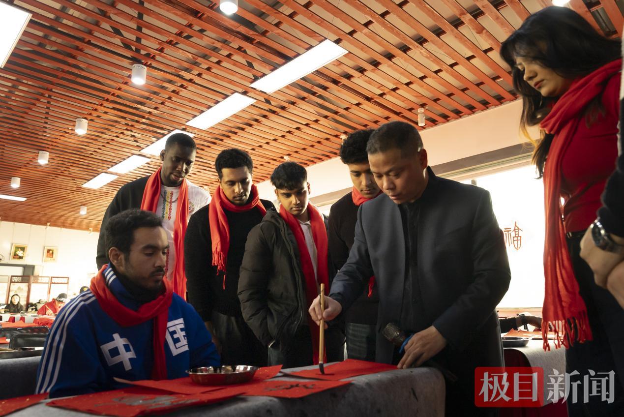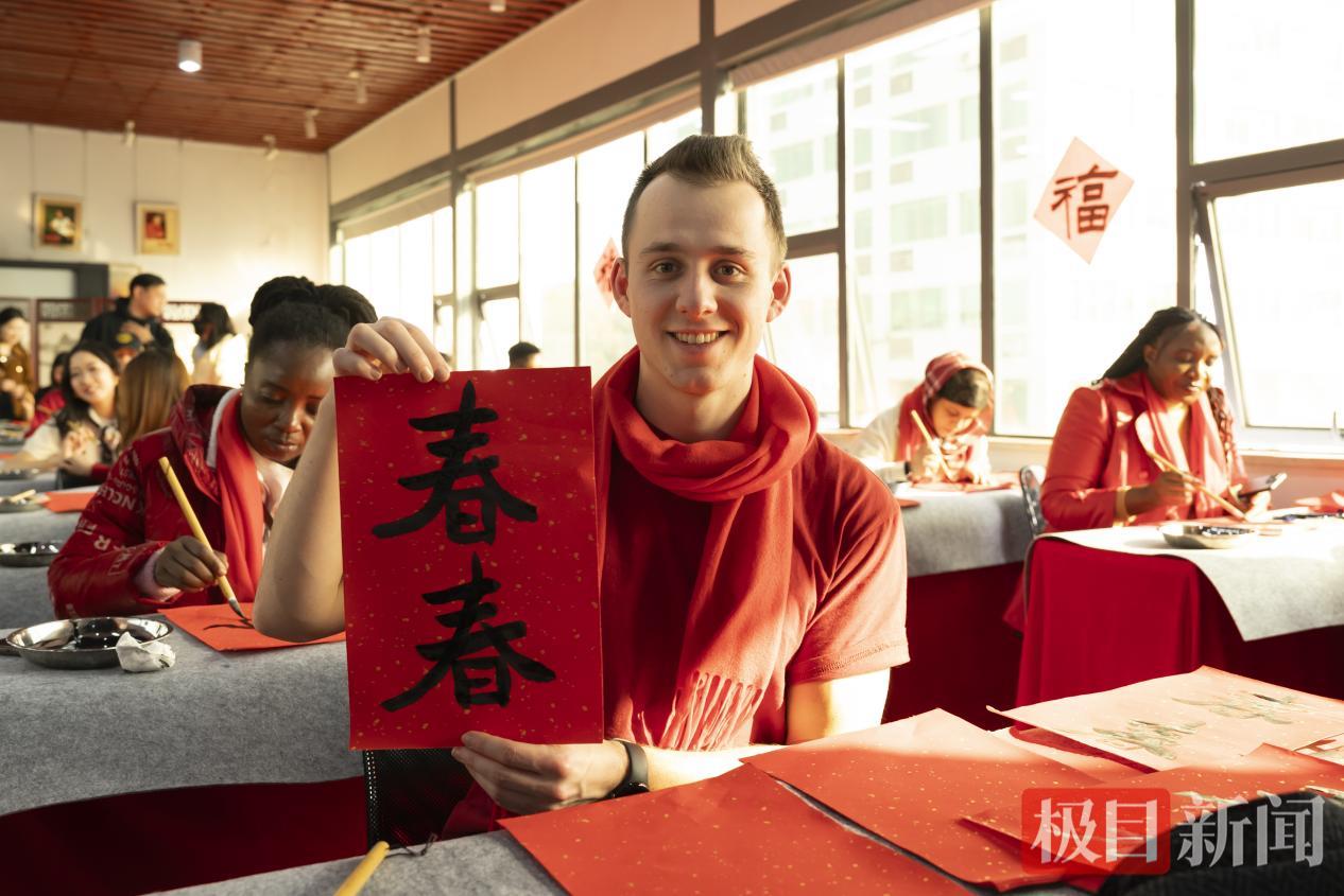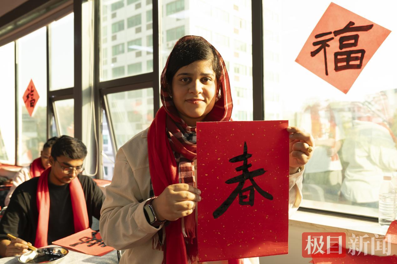 活动现场,特邀中国书法家协会会员、湖北省书法家协会理事、湖北画报社董事长陈明华进行书法指导。来自30多个国家的50多名留学生在陈老师的带领下,系统学习春联文化与书法规范,并亲手书写“福”字与春联,沉浸式体验中国春节的传统习俗。