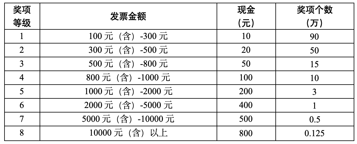 三期大抽奖,奖品实实在在!每期参与即开即奖的合格数电发票自动进入定期大奖池。每期设有4个奖项等级,采取实物奖品方式。