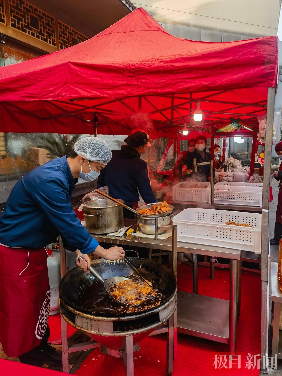 炸货嗞嗞作响,香气漫过街巷。1月23日上午,承载着江城百年烟火的老字号德华楼六渡桥店正在开展第五届年货节,热气氤氲、人流涌动,现炸鱼块、藕夹、肉圆、雪白的水磨年糕,还有汤包、水饺等冻品一字排开,每一样都裹着浓浓年意。武汉市民老早来到摊位前,抢着买走第一锅新鲜出炉的美食。