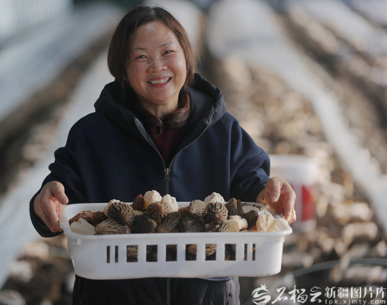 2月14日,种植户在乌鲁木齐高新技术产业开发区(新市区)安宁渠镇河西村羊肚菌智能温室大棚展示刚刚采摘的头茬羊肚菌。