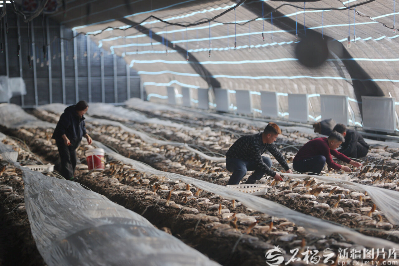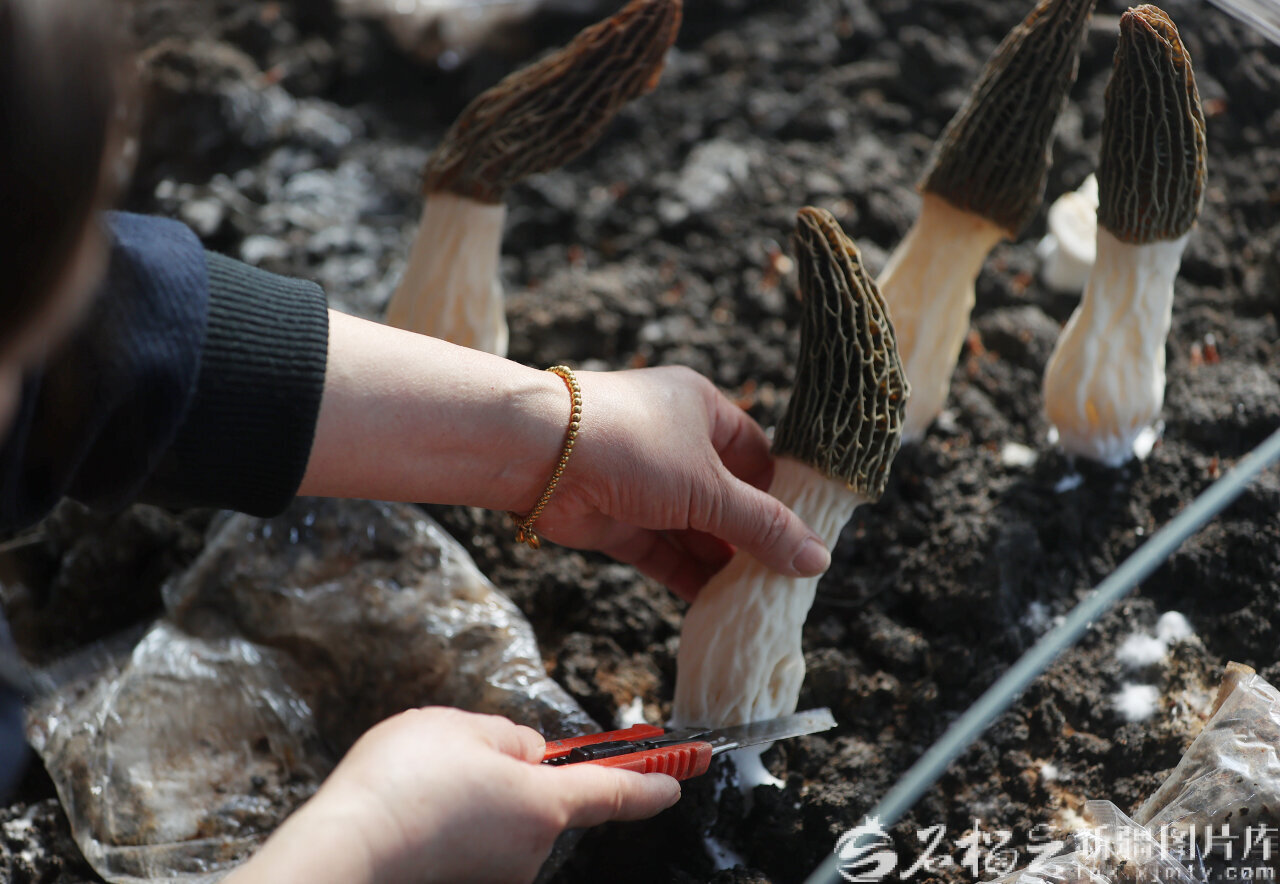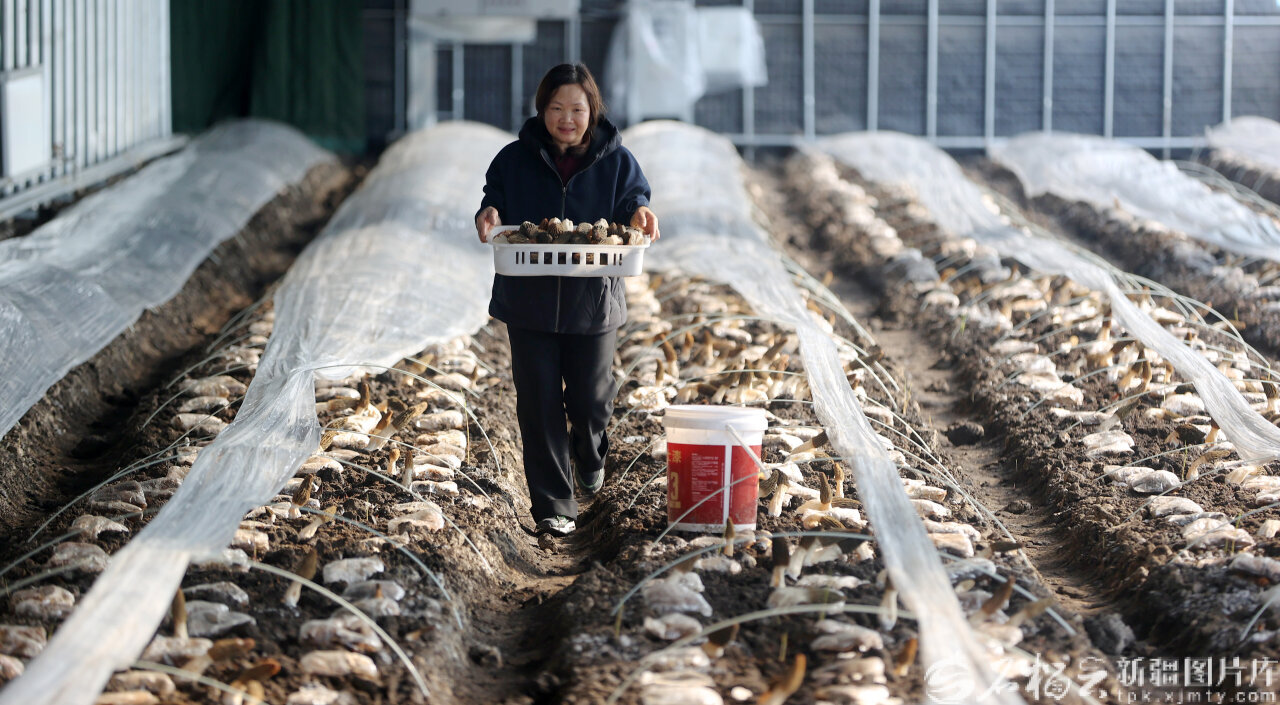 2月14日,种植户在乌鲁木齐高新技术产业开发区(新市区)安宁渠镇河西村羊肚菌智能温室大棚采摘羊肚菌。