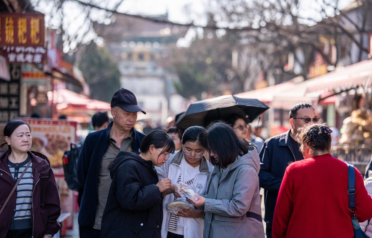 2月18日,游客在昆明市官渡古镇品尝官渡粑粑。新华社记者 江文耀 摄