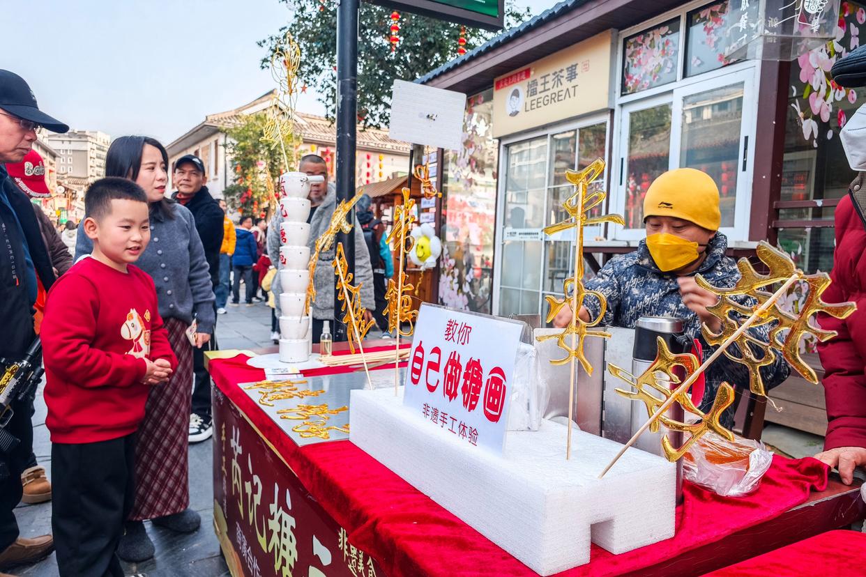 2月17日,游客(左)在湖南常德河街购买糖画。新华社记者 陈思汗 摄