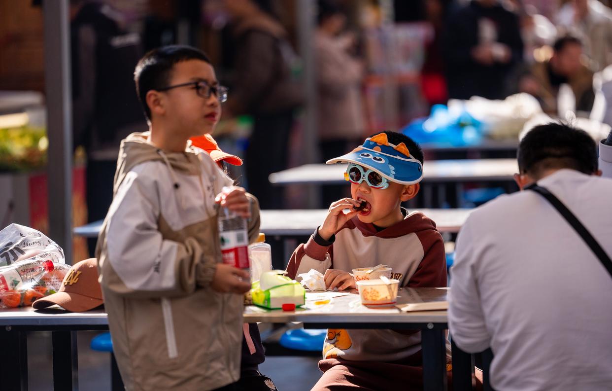 2月18日,小朋友们在昆明市官渡古镇品尝美食。新华社记者 江文耀 摄