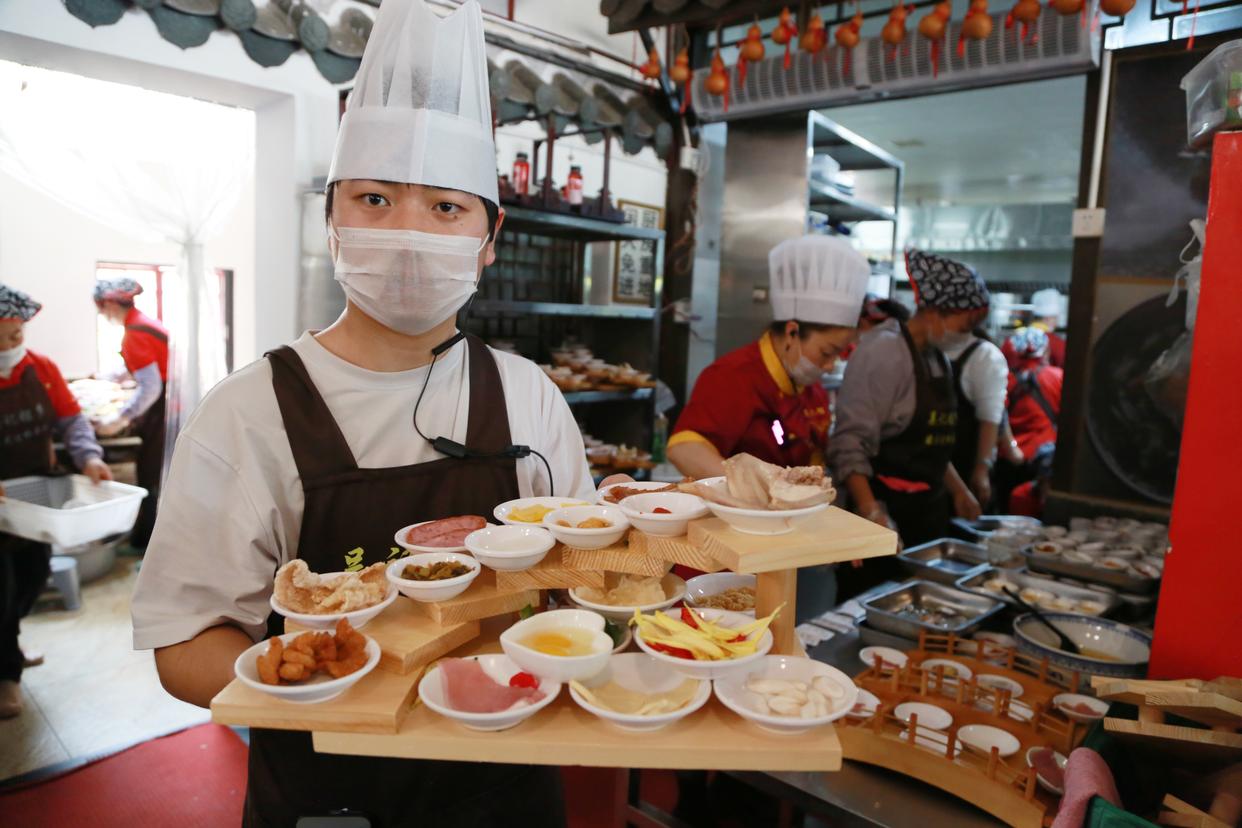 2月18日,在山东省邹平市黄山街道悠乐里商业区,工作人员在准备午餐。新华社发(董乃德摄)