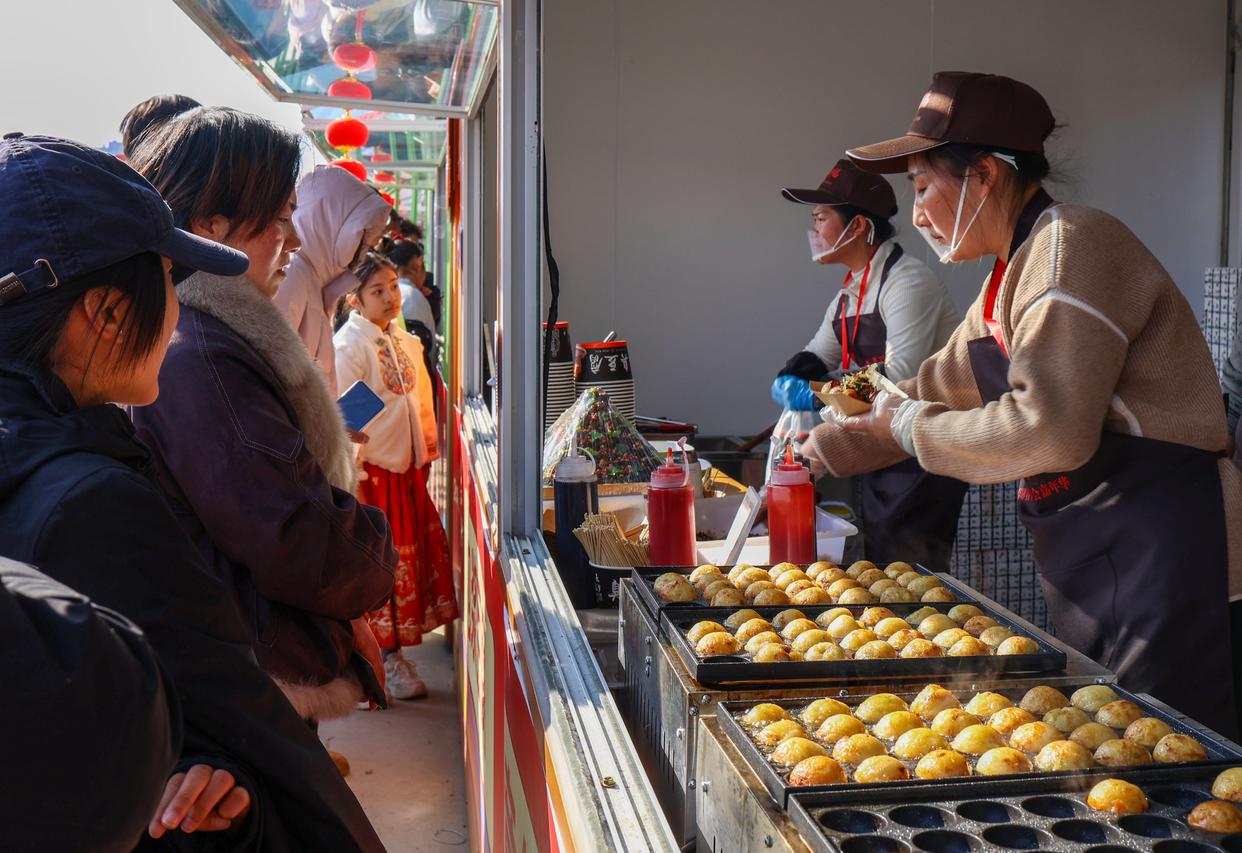 2月18日,游客在北京烟袋斜街品尝美食。新华社记者 李欣 摄