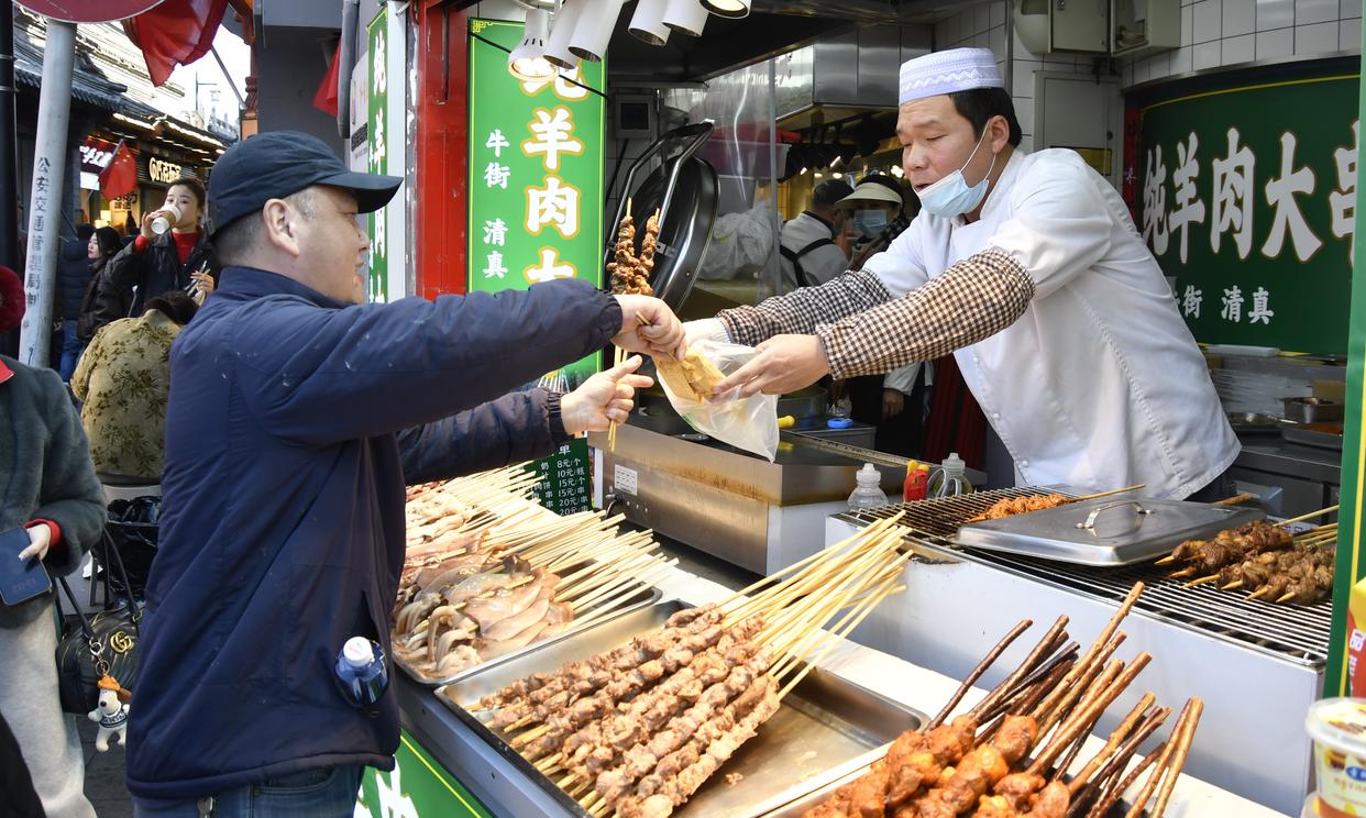 2月18日,在陕西延安的金延安街区,游客在品尝大串烤肉。新华社发(祁小军摄)