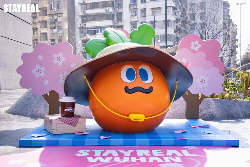 “卜卜”是MOJO FAMILY的核心IP形象,一只胡萝卜造型的卡通角色。这次武汉站正好赶上樱花季,主办方给它戴上了粉色樱花草帽,还做了个《和卜卜一起公园野餐》的春日限定装置,供市民拍照打卡。