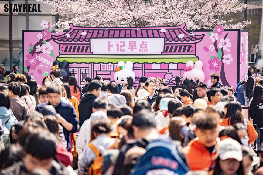 现场还融入了武汉的“过早”文化。一个叫“Rabbit.Q打卡墙”的装置,灵感来自武汉的楼阁轮廓,背景里一只兔子捧着一碗热干面,店外是盛开的樱花。装置名字里还有“卜记早茶”“咵天”这些武汉方言,想把潮流IP和本地生活搭上边。