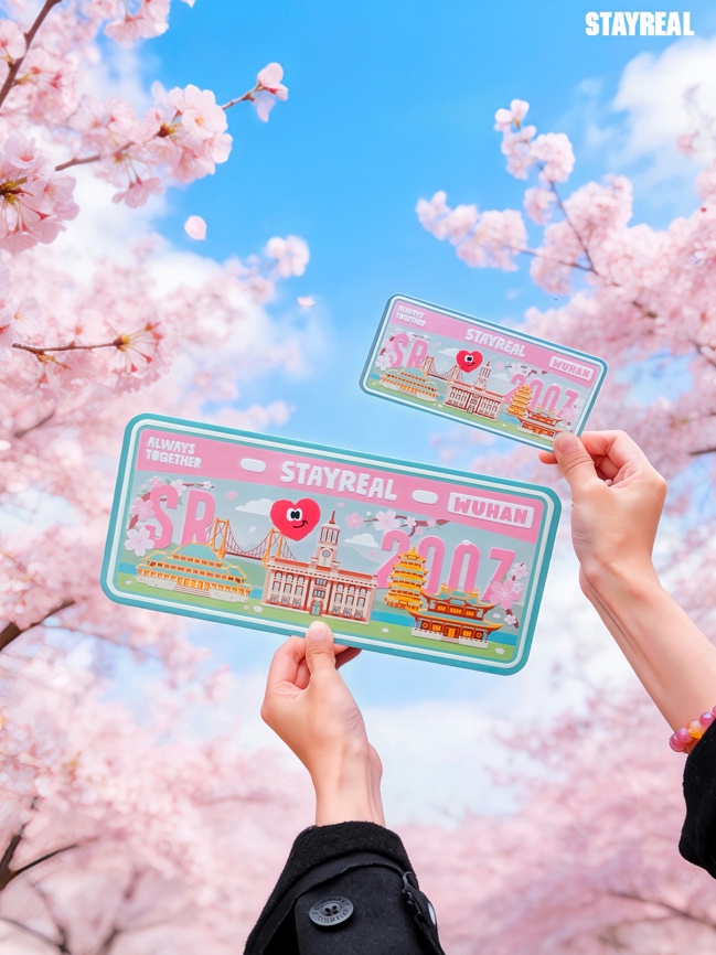 对粉丝来说,限定周边是这次活动的一大看点。现场卖的“爱WUHAN限定车牌&冰箱贴”,把黄鹤楼、长江大桥、江汉关、湖北省博物馆、晴川阁这些武汉地标做进了设计里。粉绿配色,绿色是江滩的新绿,粉色是樱花,把城市记忆和春日气息一起打包带走。
