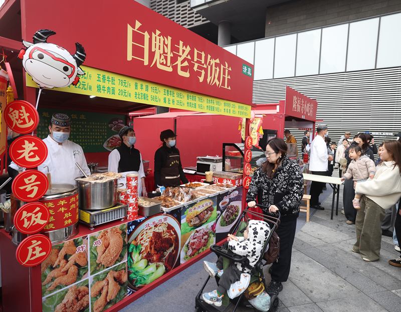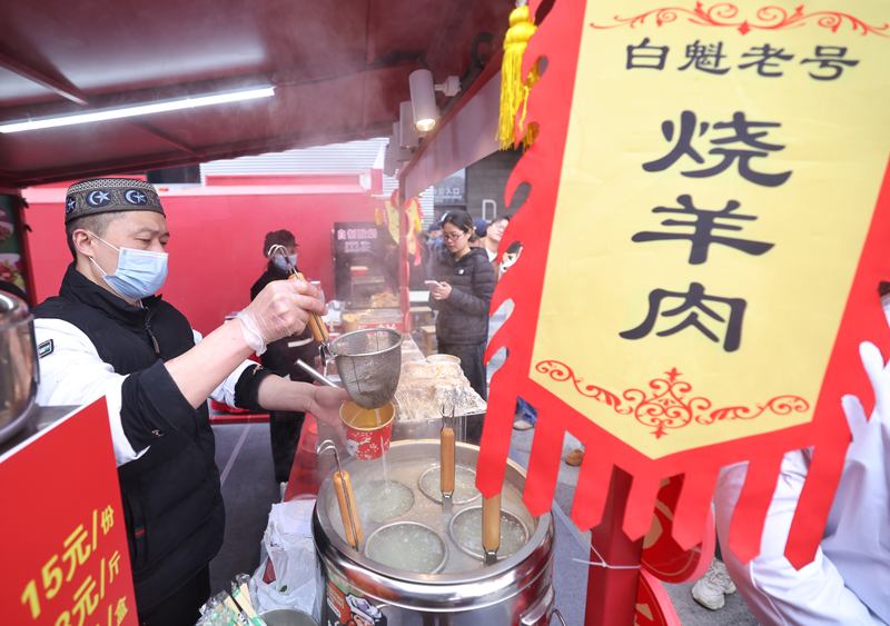 同样回归故里的还有白魁老号。白魁老号饭庄宽街店店长林百良站在摊位前,一边招呼顾客一边感慨:“咱们白魁是百年老店,从清代乾隆五年就在隆福寺街里了,在这儿待了200多年。这次回来,说白了就是回归故里。”白魁老号带来了它的招牌菜烧羊肉——这道菜曾是清代御膳房指定的进贡菜品,有三种经典吃法:下酒、夹烧饼、做羊肉面。此外,酱牛肉、白水羊头、老北京爆肚等清真小吃也悉数登场。